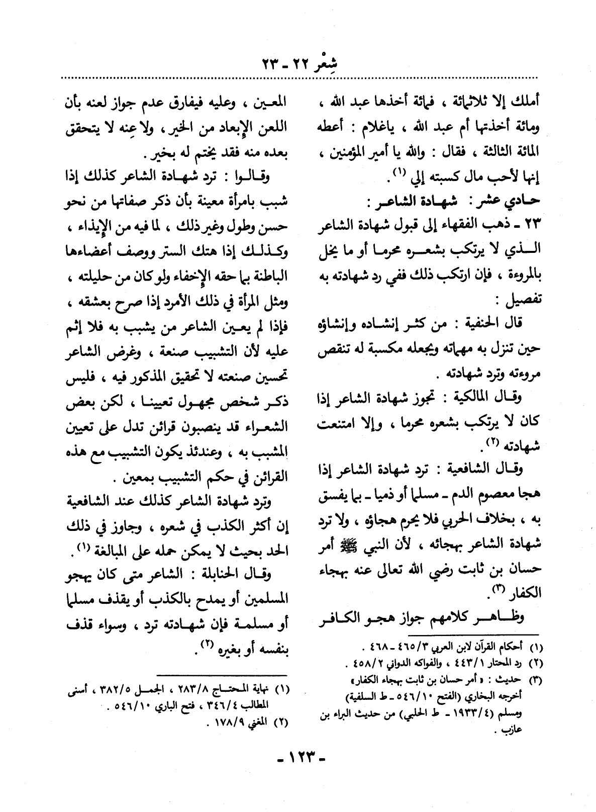 23 - ذَهَبَ الْفُقَهَاءُ إِلَى قَبُول شَهَادَةِ الشَّاعِرِ الَّذِي لاَ يَرْتَكِبُ بِشِعْرِهِ مُحَرَّمًا أَوْ مَا يُخِل بِالْمُرُوءَةِ، فَإِنِ ارْتَكَبَ ذَلِكَ فَفِي رَدِّ شَهَادَتِهِ بِهِ تَفْصِيلٌ: