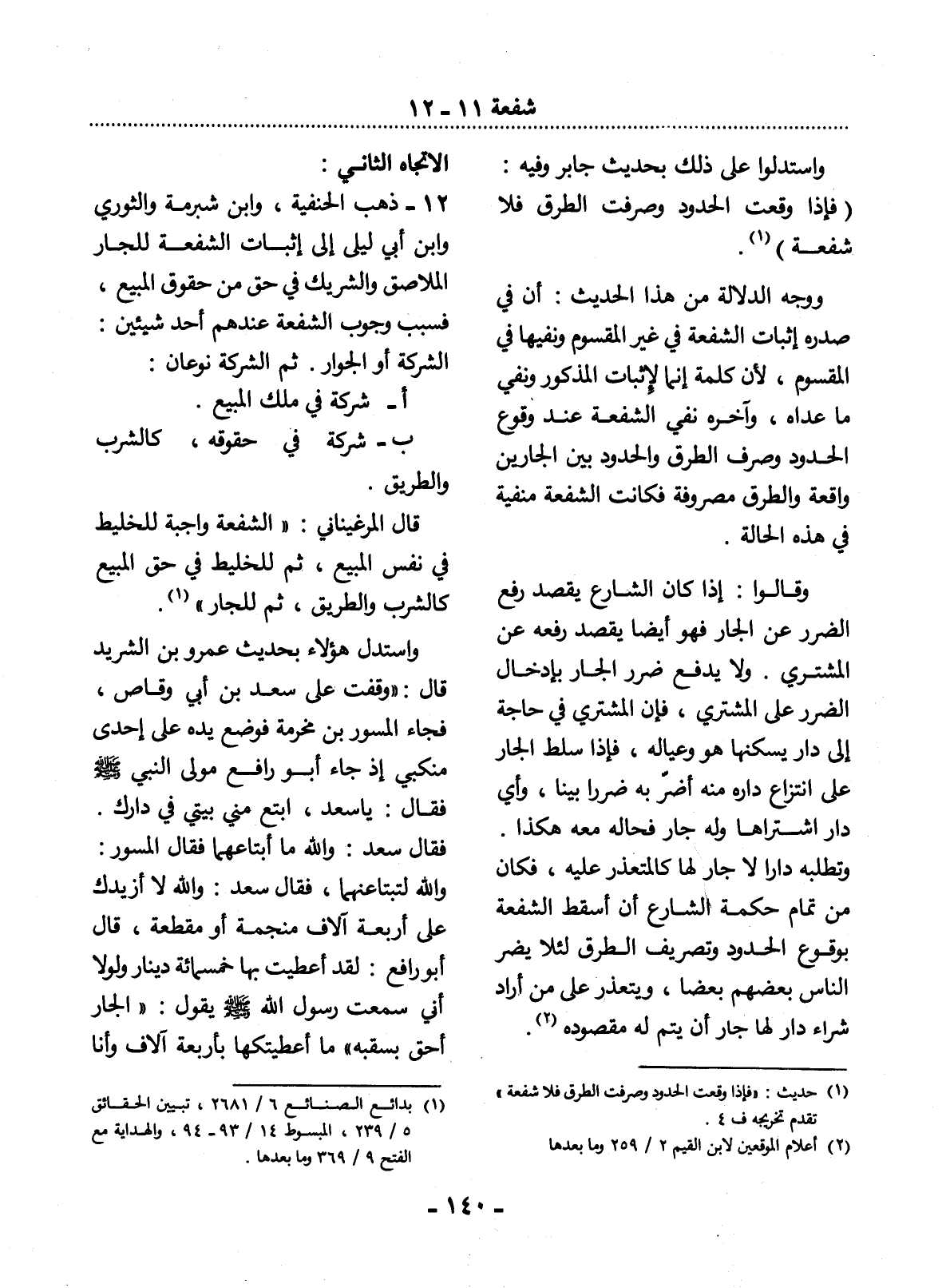 12 - ذَهَبَ الْحَنَفِيَّةُ، وَابْنُ شُبْرُمَةَ وَالثَّوْرِيُّ وَابْنُ أَبِي لَيْلَى إِلَى إِثْبَاتِ الشُّفْعَةِ لِلْجَارِ الْمُلاَصِقِ وَالشَّرِيكِ فِي حَقٍّ مِنْ حُقُوقِ الْمَبِيعِ، فَسَبَبُ وُجُوبِ الشُّفْعَةِ عِنْدَهُمْ أَحَدُ شَيْئَيْنِ: الشَّرِكَةُ أَوِ الْجِوَارُ. ثُمَّ الشَّرِكَةُ نَوْعَانِ: