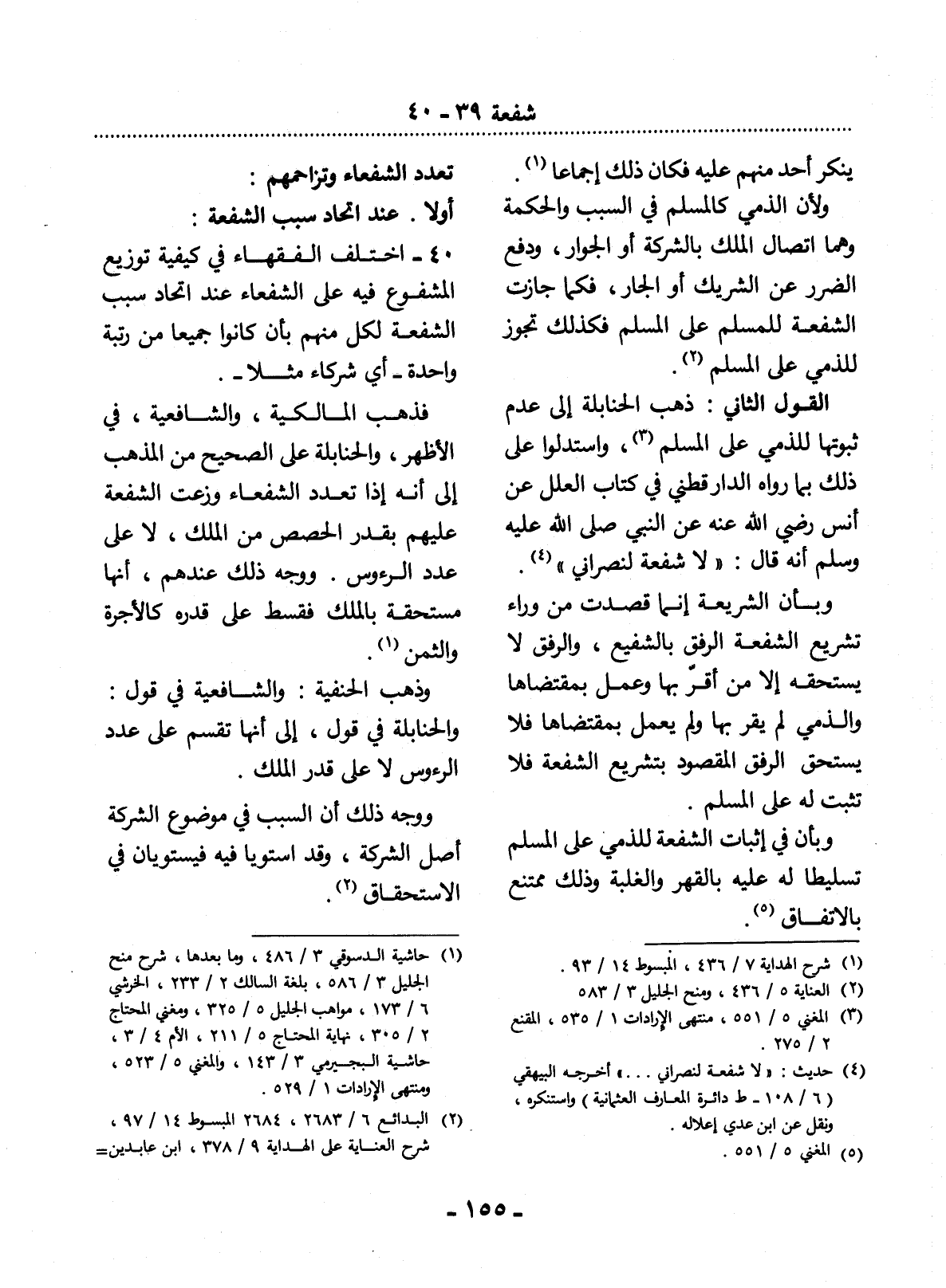 40 - اخْتَلَفَ الْفُقَهَاءُ فِي كَيْفِيَّةِ تَوْزِيعِ الْمَشْفُوعِ فِيهِ عَلَى الشُّفَعَاءِ عِنْدَ اتِّحَادِ سَبَبِ الشُّفْعَةِ لِكُلٍّ مِنْهُمْ بِأَنْ كَانُوا جَمِيعًا مِنْ رُتْبَةٍ وَاحِدَةٍ - أَيْ شُرَكَاءَ مَثَلاً -