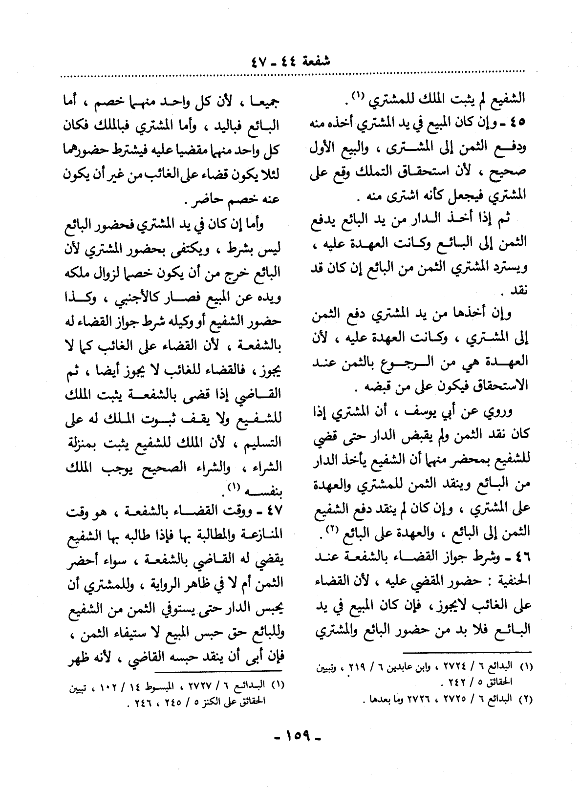 47 - وَوَقْتُ الْقَضَاءِ بِالشُّفْعَةِ، هُوَ وَقْتُ الْمُنَازَعَةِ وَالْمُطَالَبَةِ بِهَا فَإِذَا طَالَبَهُ بِهَا الشَّفِيعُ يَقْضِي لَهُ الْقَاضِي بِالشُّفْعَةِ، سَوَاءٌ أَحْضَرَ الثَّمَنَ أَمْ لاَ فِي ظَاهِرِ الرِّوَايَةِ، وَلِلْمُشْتَرِي أَنْ يَحْبِسَ الدَّارَ حَتَّى يَسْتَوْفِيَ الثَّمَنَ مِنَ الشَّفِيعِ وَلِلْبَائِعِ حَقُّ حَبْسِ الْمَبِيعِ لاِسْتِيفَاءِ الثَّمَنِ، فَإِنْ أَبَى أَنْ يَنْقُدَ حَبَسَهُ الْقَاضِي؛ لأَِنَّهُ ظَهَرَ