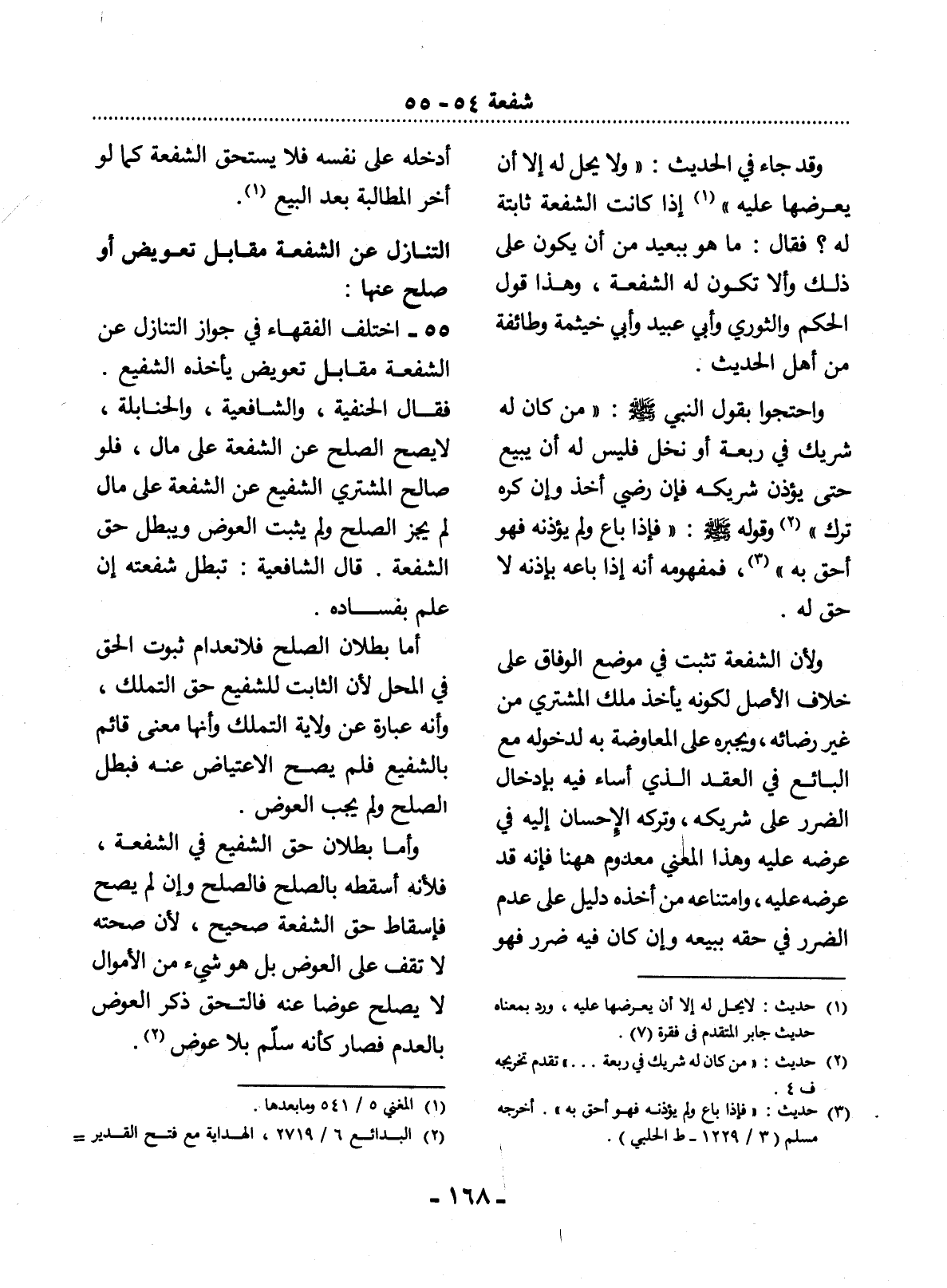 55 - اخْتَلَفَ الْفُقَهَاءُ فِي جَوَازِ التَّنَازُل عَنِ الشُّفْعَةِ مُقَابِل تَعْوِيضٍ يَأْخُذُهُ الشَّفِيعُ.