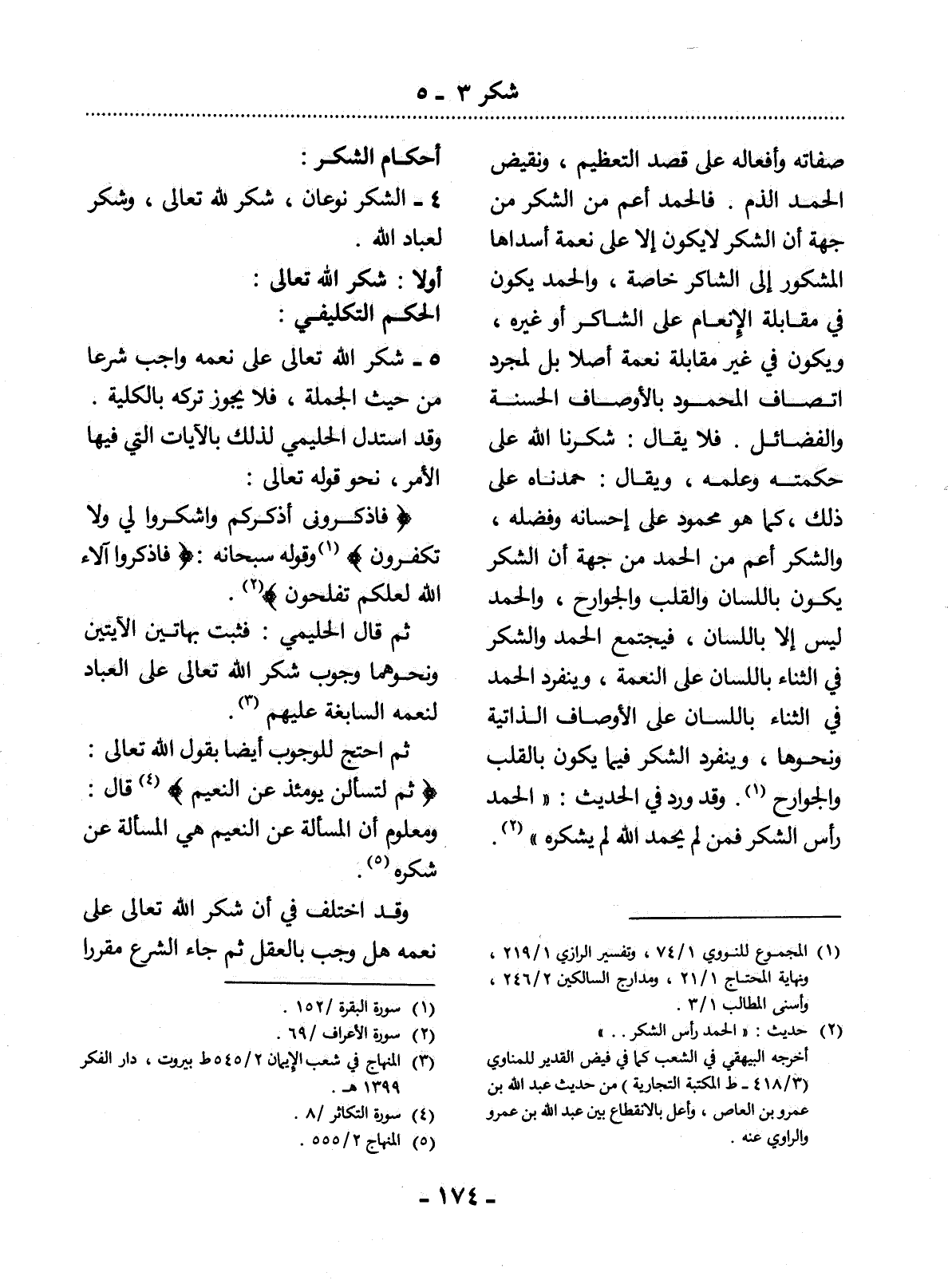5 - شُكْرُ اللَّهِ تَعَالَى عَلَى نِعَمِهِ وَاجِبٌ شَرْعًا مِنْ حَيْثُ الْجُمْلَةُ، فَلاَ يَجُوزُ تَرْكُهُ بِالْكُلِّيَّةِ. وَقَدِ اسْتَدَل الْحَلِيمِيُّ لِذَلِكَ بِالآْيَاتِ الَّتِي فِيهَا الأَْمْرُ، نَحْوِ قَوْله تَعَالَى: