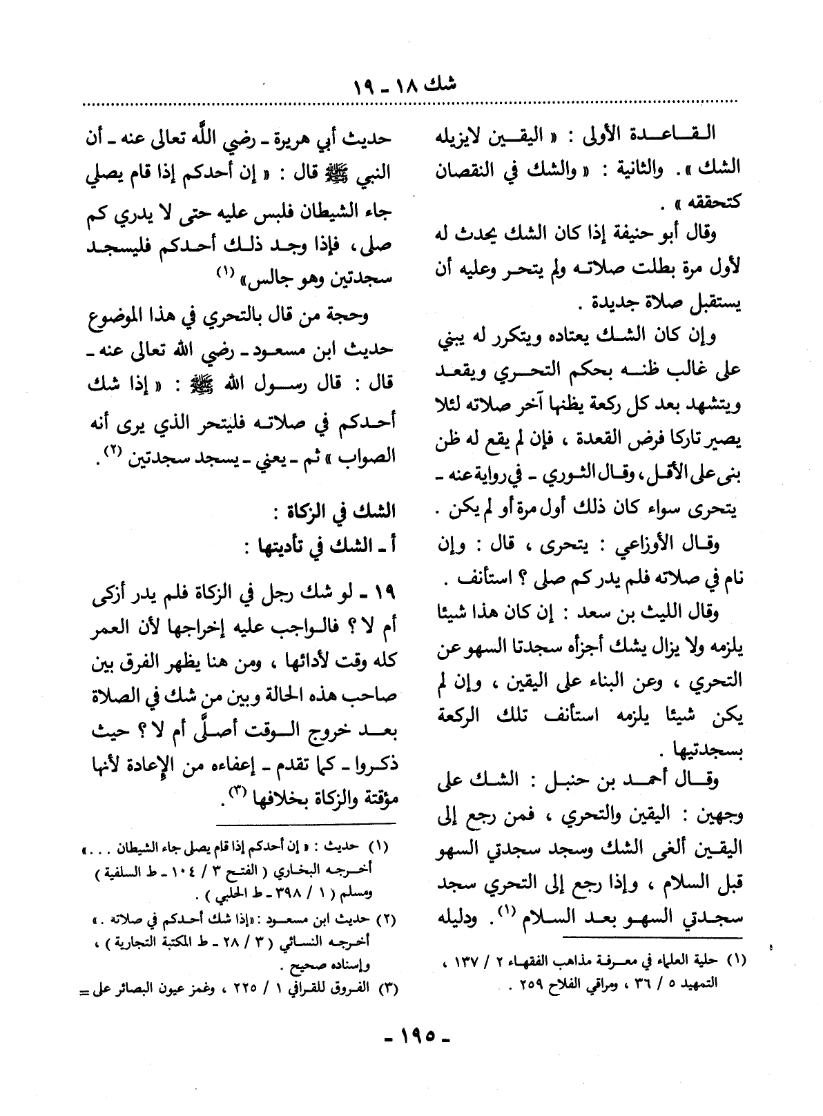 الْقَاعِدَةُ الأُْولَى: " الْيَقِينُ لاَ يُزِيلُهُ الشَّكُّ ". وَالثَّانِيَةُ: " وَالشَّكُّ فِي النُّقْصَانِ كَتَحَقُّقِهِ ".