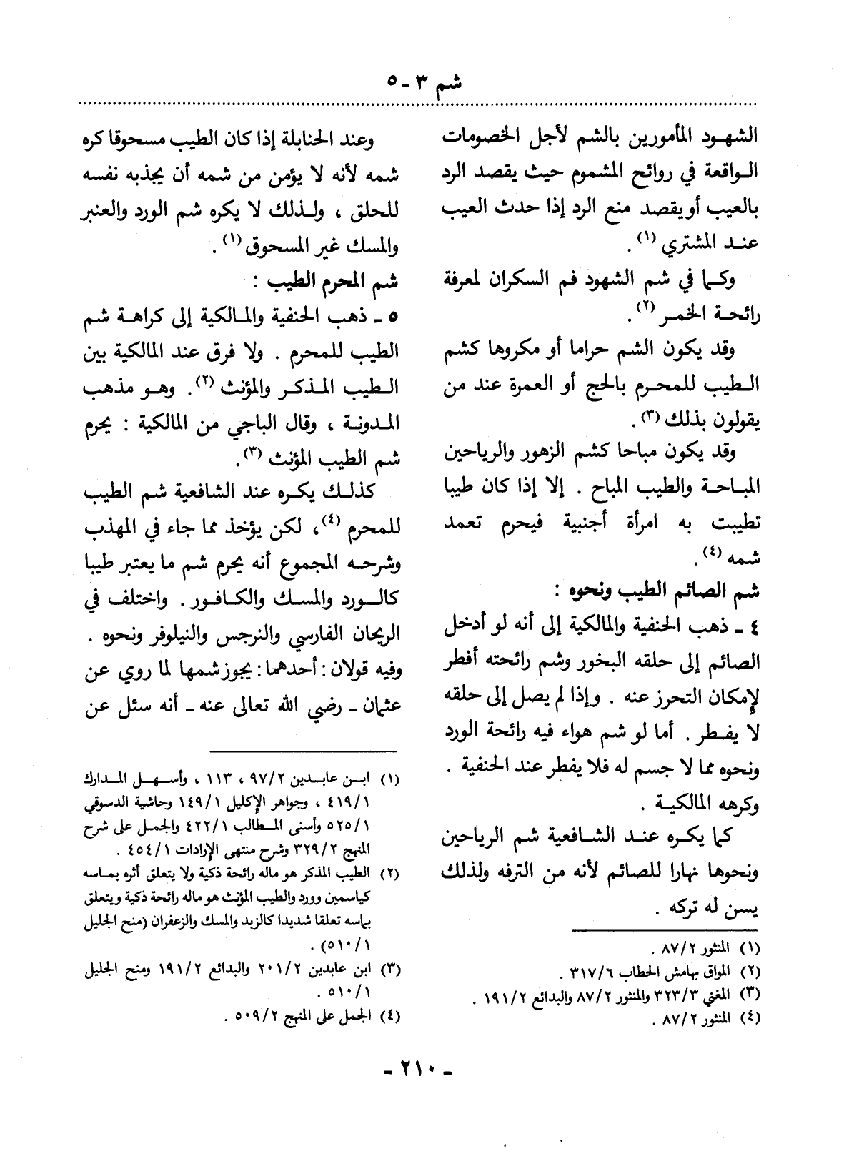 وَقَدْ يَكُونُ الشَّمُّ حَرَامًا أَوْ مَكْرُوهًا كَشَمِّ الطِّيبِ لِلْمُحْرِمِ بِالْحَجِّ أَوِ الْعُمْرَةِ عِنْدَ مَنْ يَقُولُونَ بِذَلِكَ (3) .