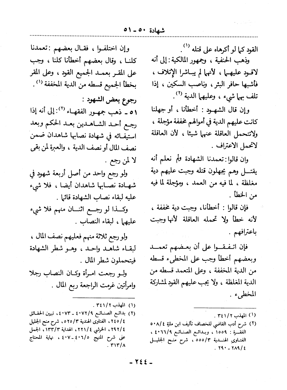 51 - ذَهَبَ جُمْهُورُ الْفُقَهَاءِ (2) : إِلَى أَنَّهُ إِذَا رَجَعَ أَحَدُ الشَّاهِدَيْنِ بَعْدَ الْحُكْمِ وَبَعْدَ اسْتِيفَائِهِ فِي شَهَادَةٍ نِصَابُهَا شَاهِدَانِ ضَمِنَ نِصْفَ الْمَال أَوْ نِصْفَ الدِّيَةِ، وَالْعِبْرَةُ لِمَنْ بَقِيَ لاَ لِمَنْ رَجَعَ.
