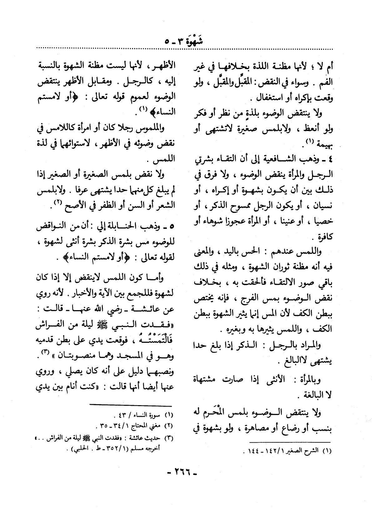 وَأَمَّا كَوْنُ اللَّمْسِ لاَ يَنْقُضُ إِلاَّ إِذَا كَانَ لِشَهْوَةٍ فَلِلْجَمْعِ بَيْنَ الآْيَةِ وَالأَْخْبَارِ. لأَِنَّهُ رُوِيَ عَنْ عَائِشَةَ - رَضِيَ اللَّهُ عَنْهَا - قَالَتْ: فَقَدْتُ النَّبِيَّ صَلَّى اللَّهُ عَلَيْهِ وَسَلَّمَ لَيْلَةً مِنَ الْفِرَاشِ فَالْتَمَسْتُهُ، فَوَقَعَتْ يَدِي عَلَى بَطْنِ قَدَمَيْهِ وَهُوَ فِي الْمَسْجِدِ وَهُمَا مَنْصُوبَتَانِ (3) . وَنَصْبُهُمَا دَلِيلٌ عَلَى أَنَّهُ كَانَ يُصَلِّي، وَرُوِيَ عَنْهَا أَيْضًا أَنَّهَا قَالَتْ: كُنْتُ أَنَامُ بَيْنَ يَدَيِ