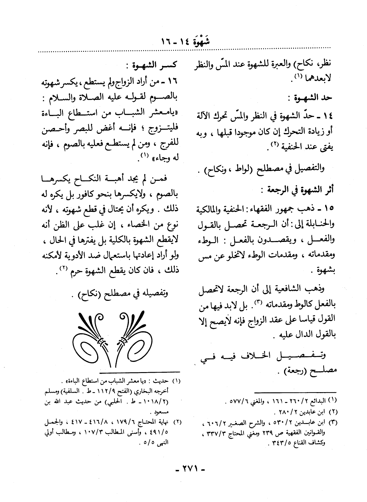 (1) حديث: " يا معشر الشباب من استطاع منكم الباءة ". أخرجه البخاري (الفتح 9 / 112 - ط. السلفية) ومسلم (2 / 1018 - ط. الحلبي) من حديث عبد الله بن مسعود.