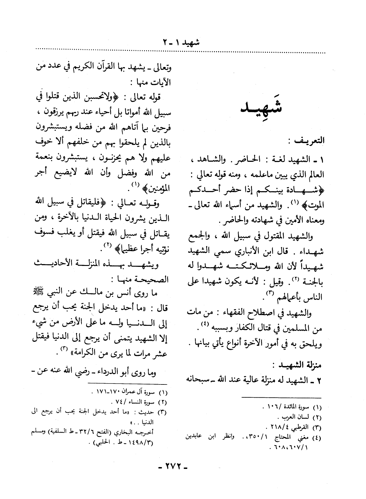 1 - الشَّهِيدُ لُغَةً: الْحَاضِرُ. وَالشَّاهِدُ، الْعَالِمُ الَّذِي يُبَيِّنُ مَا عَلِمَهُ، وَمِنْهُ قَوْله تَعَالَى: {شَهَادَةُ بَيْنِكُمْ إِذَا حَضَرَ أَحَدَكُمُ الْمَوْتُ} . (1) وَالشَّهِيدُ مِنْ أَسْمَاءِ اللَّهِ تَعَالَى - وَمَعْنَاهُ الأَْمِينُ فِي شَهَادَتِهِ وَالْحَاضِرُ.
