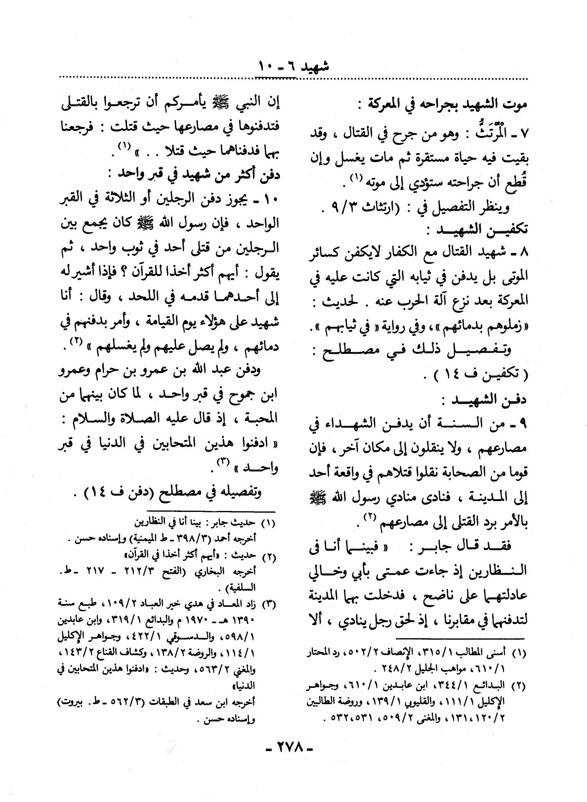 8 - شَهِيدُ الْقِتَال مَعَ الْكُفَّارِ لاَ يُكَفَّنُ كَسَائِرِ الْمَوْتَى بَل يُدْفَنُ فِي ثِيَابِهِ الَّتِي كَانَتْ عَلَيْهِ فِي الْمَعْرَكَةِ بَعْدَ نَزْعِ آلَةِ الْحَرْبِ عَنْهُ. لِحَدِيثِ: زَمِّلُوهُمْ بِدِمَائِهِمْ، وَفِي رِوَايَةٍ فِي ثِيَابِهِمْ.
