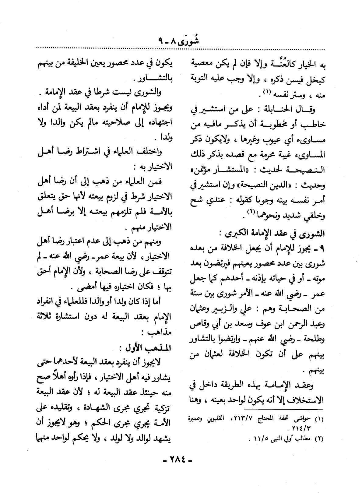 9 - يَجُوزُ لِلإِْمَامِ أَنْ يَجْعَل الْخِلاَفَةَ مِنْ بَعْدِهِ شُورَى بَيْنَ عَدَدٍ مَحْصُورٍ يُعَيِّنُهُمْ فَيَرْتَضُونَ بَعْدَ مَوْتِهِ - أَوْ فِي حَيَاتِهِ بِإِذْنِهِ - أَحَدَهُمْ كَمَا جَعَل عُمَرُ - رَضِيَ اللَّهُ عَنْهُ - الأَْمْرَ شُورَى بَيْنَ سِتَّةٍ مِنَ الصَّحَابَةِ وَهُمْ: عَلِيٌّ وَالزُّبَيْرُ وَعُثْمَانُ وَعَبْدُ الرَّحْمَنِ بْنُ عَوْفٍ وَسَعْدُ بْنُ أَبِي وَقَّاصٍ وَطَلْحَةُ - رَضِيَ اللَّهُ عَنْهُمْ - وَارْتَضَوْا بِالتَّشَاوُرِ بَيْنَهُمْ عَلَى أَنْ تَكُونَ الْخِلاَفَةُ لِعُثْمَانِ مِنْ بَيْنِهِمْ.