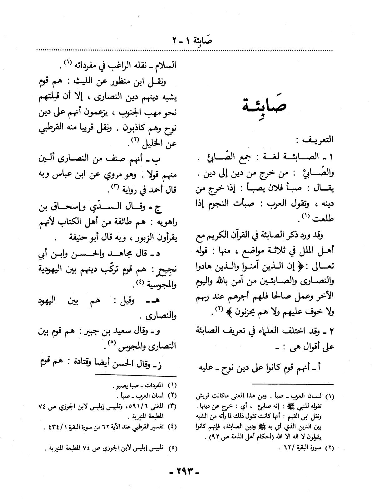 (1) لسان العرب - صبأ. ومن هذا المعنى ما كانت قريش تقوله للنبي صلى الله عليه وسلم: إنه صابئ، أي: خرج عن دينها. ونقل ابن القيم: أنها كانت تقول ذلك لما رأته من الشبه بين الدين الذي أتى به صلى الله عليه وسلم ودين الصابئة، فإنهم كانوا يقولون لا إله إلا الله (أحكام أهل الذمة ص 92) .