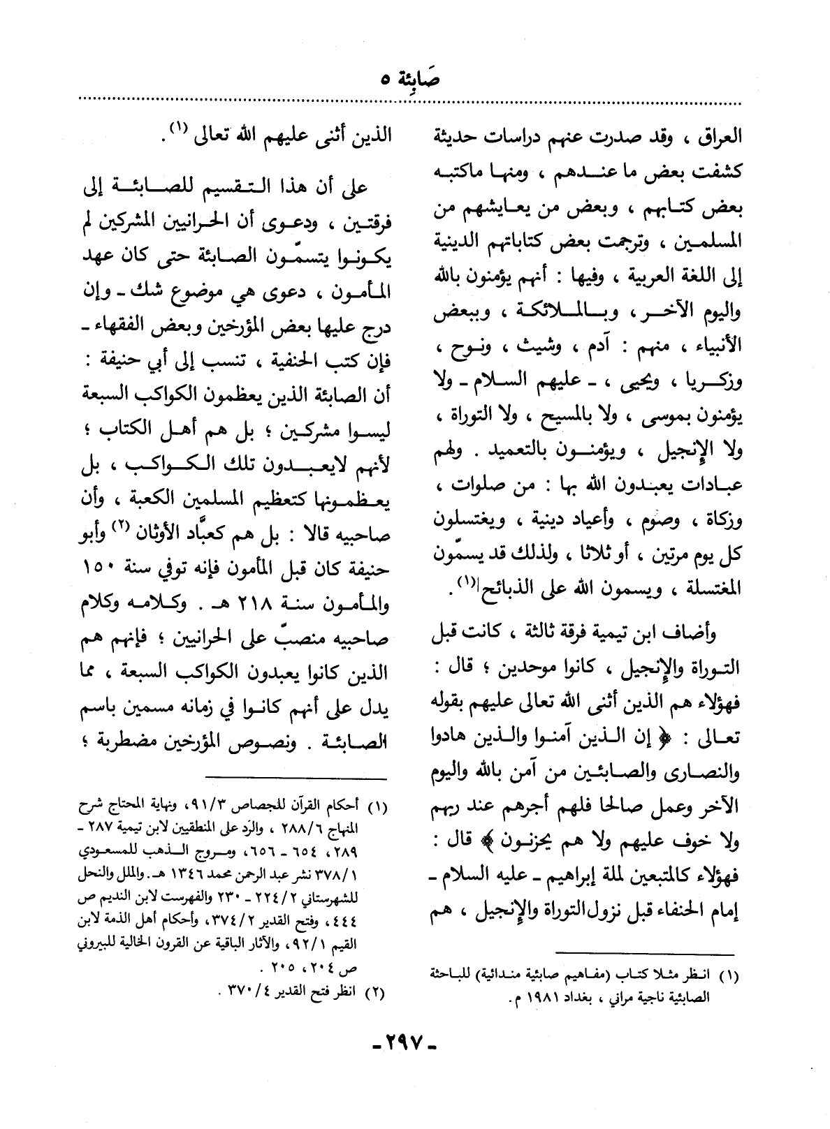 (1) انظر مثلاً كتاب (مفاهيم صابئية مندائية) للباحثة الصابئية ناجية مراني، بغداد 1981 م.