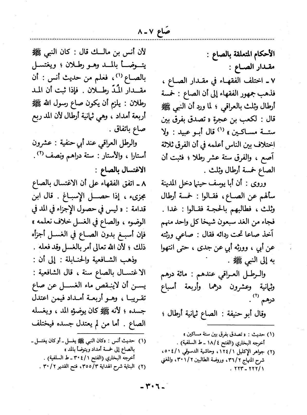 (1) حديث أنس: " كان النبي صلى الله عليه وسلم يغسل - أو كان يغتسل - بالصاع إلى خمسة أمداد ويتوضأ بالمد ". أخرجه البخاري، (الفتح 1 / 304 - ط السلفية) .
