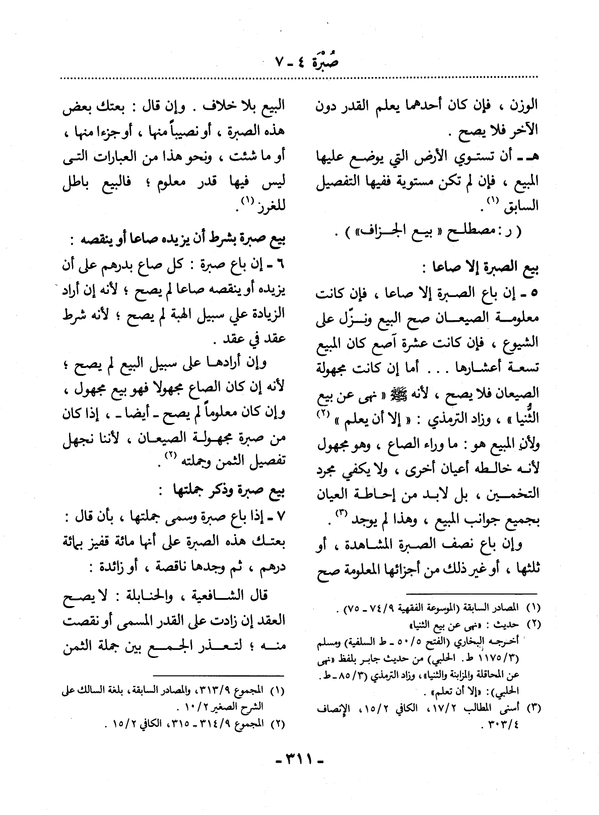 5 - إِنْ بَاعَ الصُّبْرَةَ إِلاَّ صَاعًا، فَإِنْ كَانَتْ مَعْلُومَةَ الصِّيعَانِ صَحَّ الْبَيْعُ وَنُزِّل عَلَى الشُّيُوعِ، فَإِنْ كَانَتْ عَشَرَةَ آصُعٍ كَانَ الْمَبِيعُ تِسْعَةَ أَعْشَارِهَا. . . أَمَّا إِنْ كَانَتْ مَجْهُولَةَ الصِّيعَانِ فَلاَ يَصِحُّ؛ لأَِنَّهُ صَلَّى اللَّهُ عَلَيْهِ وَسَلَّمَ نَهَى عَنْ بَيْعِ الثُّنْيَا، وَزَادَ التِّرْمِذِيُّ: إِلاَّ أَنْ يُعْلَمَ (2) وَلأَِنَّ الْمَبِيعَ هُوَ: مَا وَرَاءَ الصَّاعِ، وَهُوَ مَجْهُولٌ لأَِنَّهُ خَالَطَهُ أَعْيَانٌ أُخْرَى، وَلاَ يَكْفِي مُجَرَّدُ التَّخْمِينِ، بَل لاَ بُدَّ مِنْ إِحَاطَةِ الْعِيَانِ بِجَمِيعِ جَوَانِبِ الْمَبِيعِ، وَهَذَا لَمْ يُوجَدْ (3)