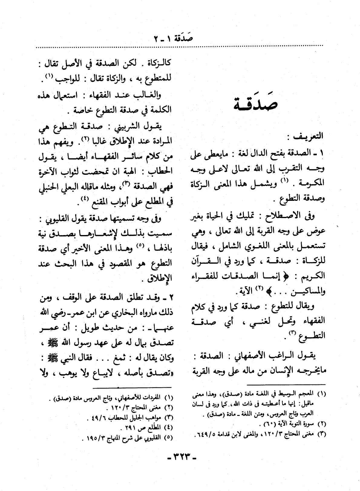 (1) المعجم الوسيط في اللغة مادة (صدق) ، وهذا معنى ما قيل: إنها ما أعطيته في ذات الله، كما ورد في لسان العرب وتاج العروس، ومتن اللغة - مادة (صدق) .