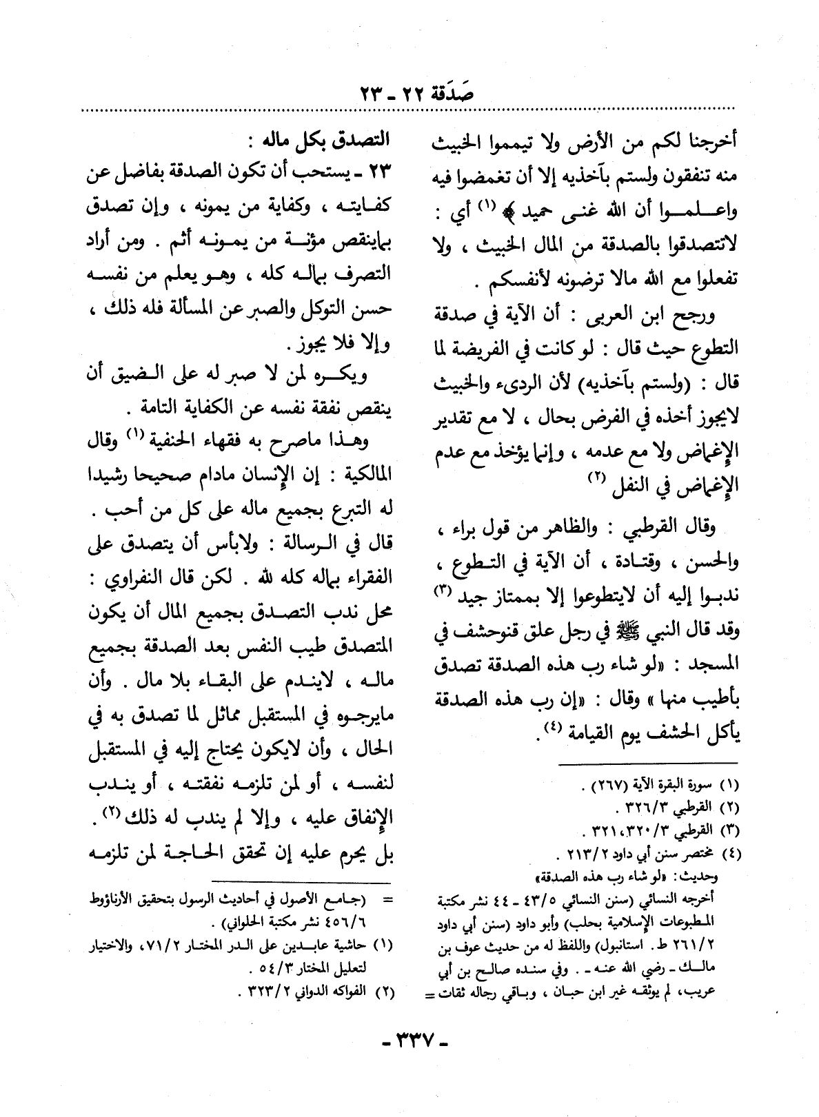 23 - يُسْتَحَبُّ أَنْ تَكُونَ الصَّدَقَةُ بِفَاضِلٍ عَنْ كِفَايَتِهِ، وَكِفَايَةِ مَنْ يَمُونُهُ، وَإِنْ تَصَدَّقَ بِمَا يُنْقِصُ مُؤْنَةَ مَنْ يَمُونُهُ أَثِمَ. وَمَنْ أَرَادَ التَّصَرُّفَ بِمَالِهِ كُلِّهِ، وَهُوَ يَعْلَمُ مِنْ نَفْسِهِ حُسْنَ التَّوَكُّل وَالصَّبْرِ عَنِ الْمَسْأَلَةِ فَلَهُ ذَلِكَ، وَإِلاَّ فَلاَ يَجُوزُ.