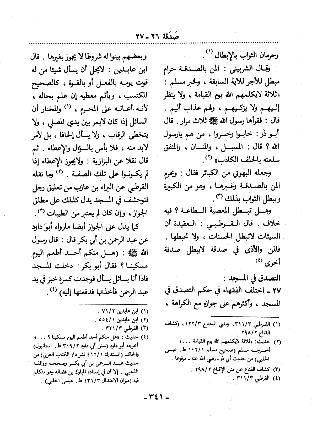 27 - اخْتَلَفَ الْفُقَهَاءُ فِي حُكْمِ التَّصَدُّقِ فِي الْمَسْجِدِ، وَأَكْثَرُهُمْ عَلَى جَوَازِهِ مَعَ الْكَرَاهَةِ،