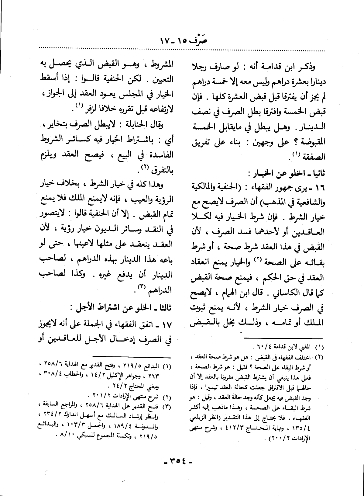 16 - يَرَى جُمْهُورُ الْفُقَهَاءِ: (الْحَنَفِيَّةُ وَالْمَالِكِيَّةُ وَالشَّافِعِيَّةُ فِي الْمَذْهَبِ) أَنَّ الصَّرْفَ لاَ يَصِحُّ مَعَ خِيَارِ الشَّرْطِ. فَإِنْ شُرِطَ الْخِيَارُ فِيهِ لِكِلاَ الْعَاقِدَيْنِ أَوْ لأَِحَدِهِمَا فَسَدَ الصَّرْفُ، لأَِنَّ الْقَبْضَ فِي هَذَا الْعَقْدِ شَرْطُ صِحَّةٍ، أَوْ شَرْطُ بَقَائِهِ عَلَى الصِّحَّةِ (2) وَالْخِيَارُ يَمْنَعُ انْعِقَادَ الْعَقْدِ فِي حَقِّ الْحُكْمِ، فَيَمْنَعُ صِحَّةَ الْقَبْضِ كَمَا قَال الْكَاسَانِيُّ. قَال ابْنُ الْهُمَامِ، لاَ يَصِحُّ فِي الصَّرْفِ خِيَارُ الشَّرْطِ؛ لأَِنَّهُ يَمْنَعُ ثُبُوتَ الْمِلْكِ أَوْ تَمَامَهُ، وَذَلِكَ يُخِل بِالْقَبْضِ