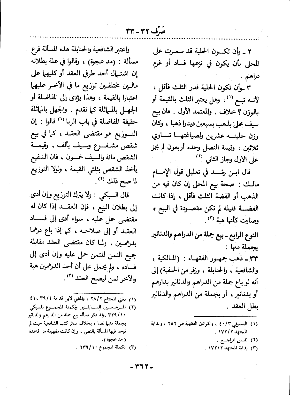 33 - ذَهَبَ جُمْهُورُ الْفُقَهَاءِ: (الْمَالِكِيَّةُ، وَالشَّافِعِيَّةُ، وَالْحَنَابِلَةُ، وَزُفَرُ مِنَ الْحَنَفِيَّةِ) إِلَى أَنَّهُ لَوْ بَاعَ جُمْلَةً مِنَ الدَّرَاهِمِ وَالدَّنَانِيرِ بِدَرَاهِمَ أَوْ بِدَنَانِيرَ، أَوْ بِجُمْلَةٍ مِنَ الدَّرَاهِمِ وَالدَّنَانِيرِ بَطَل الْعَقْدُ.