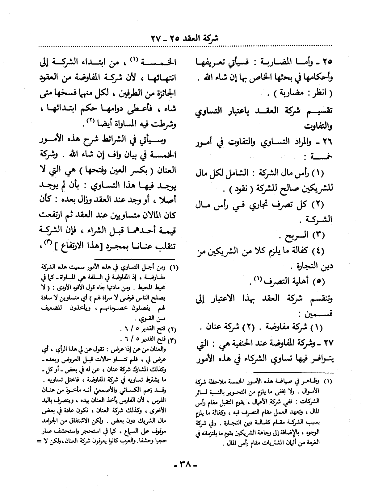 (3) فتح القدير 5 / 6. والعنان من عن إذا عرض: تقول عن لي هذا الرأي، أي: عرض لي، فلم تتساو حالات قبل العروض وبعده - وكذلك المشارك شركة عنان، عن له في بعض - أو كل - ما يشترط تساويه في شركة المفاوضة، فاختل تساويه. وقد زعم الكسائي والأصمعي أنه مأخوذ من عنان الفرس؛ لأن الفا فتح القدير 5 / 20.