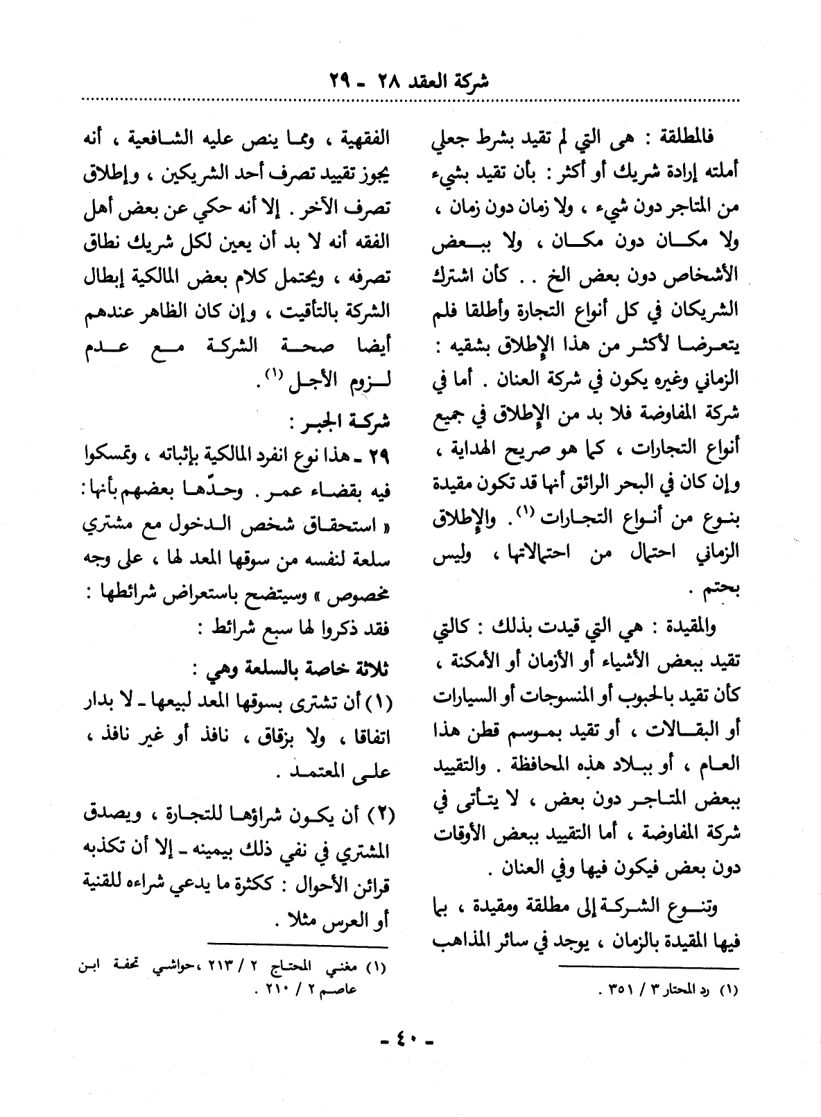 الْفِقْهِيَّةِ، وَمِمَّا يَنُصُّ عَلَيْهِ الشَّافِعِيَّةُ، أَنَّهُ يَجُوزُ تَقْيِيدُ تَصَرُّفِ أَحَدِ الشَّرِيكَيْنِ، وَإِطْلاَقُ تَصَرُّفِ الآْخَرِ. إِلاَّ أَنَّهُ حُكِيَ عَنْ بَعْضِ أَهْل الْفِقْهِ أَنَّهُ لاَ بُدَّ أَنْ يُعَيَّنَ لِكُل شَرِيكٍ نِطَاقُ تَصَرُّفِهِ، وَيَحْتَمِل كَلاَمُ بَعْضِ الْمَالِكِيَّةِ إِبْطَال الشَّرِكَةِ بِالتَّأْقِيتِ، وَإِنْ كَانَ الظَّاهِرُ عِنْدَهُمْ أَيْضًا صِحَّةُ الشَّرِكَةِ مَعَ عَدَمِ لُزُومِ الأَْجَل (1) .