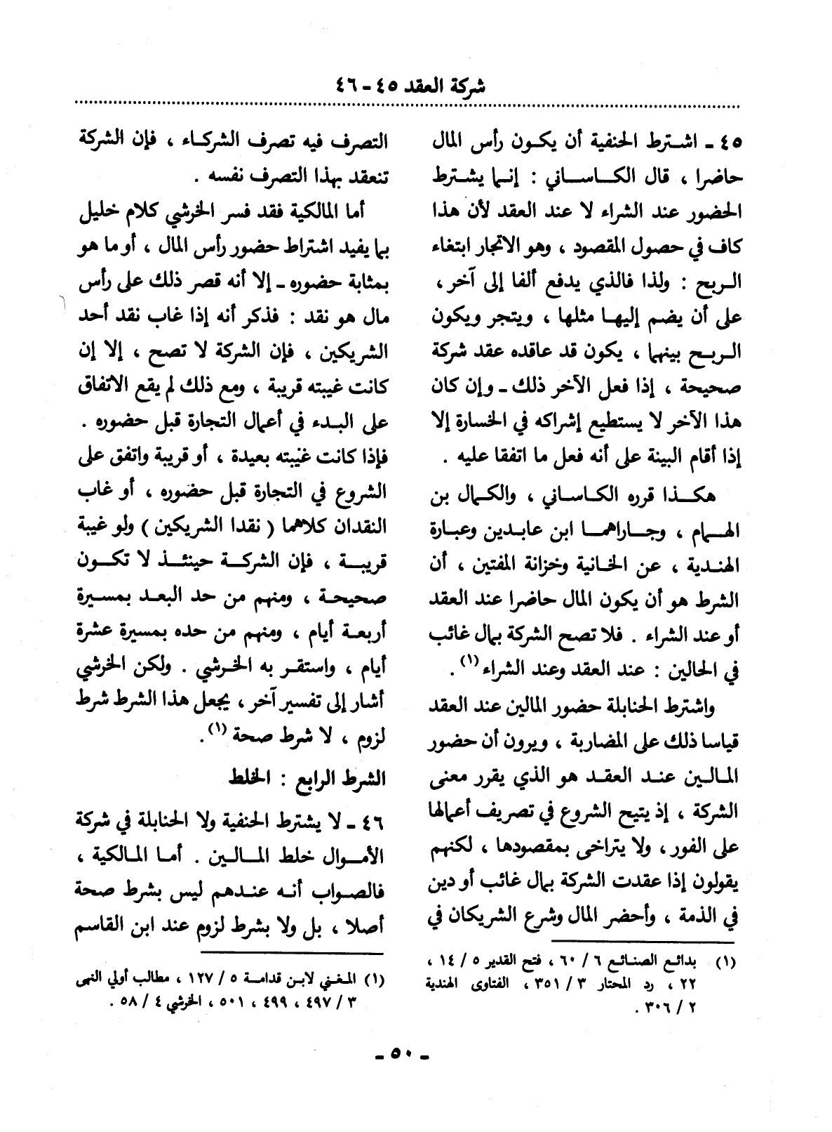 هَكَذَا قَرَّرَهُ الْكَاسَانِيُّ، وَالْكَمَال بْنُ الْهُمَامِ، وَجَارَاهُمَا ابْنُ عَابِدِينَ وَعِبَارَةُ الْهِنْدِيَّةِ، عَنِ الْخَانِيَّةِ وَخِزَانَةِ الْمُفْتِينَ، أَنَّ الشَّرْطَ هُوَ أَنْ يَكُونَ الْمَال حَاضِرًا عِنْدَ الْعَقْدِ أَوْ عِنْدَ الشِّرَاءِ. فَلاَ تَصِحُّ الشَّرِكَةُ بِمَالٍ غَائِبٍ فِي الْحَالَيْنِ: عِنْدَ الْعَقْدِ وَعِنْدَ الشِّرَاءِ (1) .
