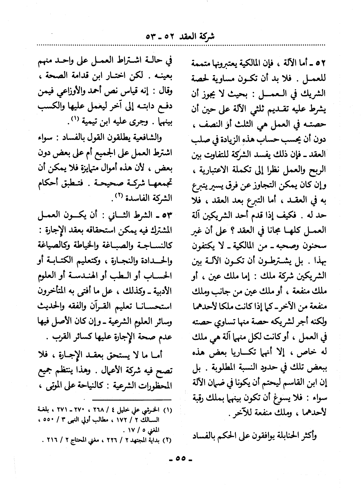 34 - أَمَّا الآْلَةُ، فَإِنَّ الْمَالِكِيَّةَ يَعْتَبِرُونَهَا مُتَمِّمَةً لِلْعَمَل. فَلاَ بُدَّ أَنْ تَكُونَ مُسَاوِيَةً لِحِصَّةِ الشَّرِيكِ فِي الْعَمَل: بِحَيْثُ لاَ يَجُوزُ أَنْ يَشْرِطَ عَلَيْهِ تَقْدِيمَ ثُلُثَيِ الآْلَةِ عَلَى حِينِ أَنَّ حِصَّتَهُ فِي الْعَمَل هِيَ الثُّلُثُ أَوِ النِّصْفُ، دُونَ أَنْ يَحْسِبَ حِسَابَ هَذِهِ الزِّيَادَةِ فِي صُلْبِ الْعَقْدِ - فَإِنَّ ذَلِكَ يُفْسِدُ الشَّرِكَةَ لِلتَّفَاوُتِ بَيْنَ الرِّبْحِ وَالْعَمَل نَظَرًا إِلَى تَكْمِلَةِ الاِعْتِبَارِيَّةِ، وَإِنْ كَانَ يُمْكِنُ التَّجَاوُزُ عَنْ فَرْقٍ يَسِيرٍ يَتَبَرَّعُ بِهِ فِي الْعَقْدِ، أَمَّا التَّبَرُّعُ بَعْدَ الْعَقْدِ، فَلاَ حَدَّ لَهُ. فَكَيْفَ إِذَا قَدَّمَ أَحَدُ الشَّرِيكَيْنِ آلَةَ الْعَمَل كُلَّهَا مَجَّانًا فِي الْعَقْدِ؟ عَلَى أَنَّ غَيْرَ سَحْنُونٍ وَصَحْبِهِ - مِنَ الْمَالِكِيَّةِ - لاَ يَكْتَفُونَ بِهَذَا. بَل يَشْتَرِطُونَ أَنْ تَكُونَ الآْلَةُ بَيْنَ الشَّرِيكَيْنِ شَرِكَةَ مِلْكٍ: إِمَّا مِلْكَ عَيْنٍ، أَوْ مِلْكَ مَنْفَعَةٍ، أَوْ مِلْكَ عَيْنٍ مِنْ جَانِبٍ وَمِلْكَ مَنْفَعَةٍ مِنَ الآْخَرِ - كَمَا إِذَا كَانَتْ مِلْكًا لأَِحَدِهِمَا وَلَكِنَّهُ أَجَّرَ لِشَرِيكِهِ حِصَّةً مِنْهَا تُسَاوِي حِصَّتَهُ فِي الْعَمَل، أَوْ كَانَتْ لِكُلٍّ مِنْهُمَا آلَةٌ هِيَ مِلْكٌ لَهُ خَاصٌّ، إِلاَّ أَنَّهُمَا تَكَارَيَا بَعْضَ هَذِهِ بِبَعْضِ تِلْكَ فِي حُدُودِ النِّسْبَةِ الْمَطْلُوبَةِ. بَل إِنَّ ابْنَ الْقَاسِمِ لَيُحَتِّمُ أَنْ يَكُونَا فِي ضَمَانِ الآْلَةِ سَوَاءً: فَلاَ يَسُوغُ أَنْ تَكُونَ بَيْنَهُمَا بِمِلْكِ رَقَبَةٍ لأَِحَدِهِمَا، وَمِلْكِ مَنْفَعَةٍ لِلآْخَرِ.