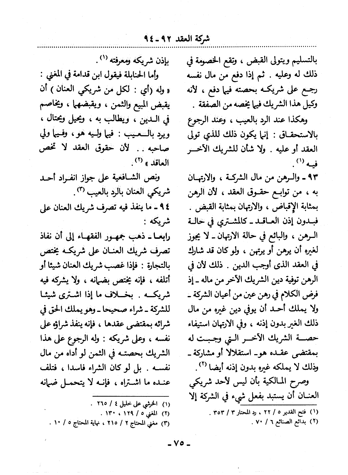 76 - وَالرَّهْنُ مِنْ مَال الشَّرِكَةِ، وَالاِرْتِهَانُ بِهِ، مِنْ تَوَابِعِ حُقُوقِ الْعَقْدِ؛ لأَِنَّ الرَّهْنَ بِمَثَابَةِ الإِْقْبَاضِ، وَالاِرْتِهَانَ بِمَثَابَةِ الْقَبْضِ. فَبِدُونِ إِذْنِ الْعَاقِدِ - كَالْمُشْتَرِي فِي حَالَةِ الرَّهْنِ، وَالْبَائِعِ فِي حَالَةِ الاِرْتِهَانِ - لاَ يَجُوزُ لِغَيْرِهِ أَنْ يَرْهَنَ أَوْ يَرْتَهِنَ، وَلَوْ كَانَ قَدْ شَارَكَ فِي الْعَقْدِ الَّذِي أَوْجَبَ الدَّيْنَ. ذَلِكَ لأَِنَّ فِي الرَّهْنِ تَوْفِيَةَ دَيْنِ الشَّرِيكِ الآْخَرِ مِنْ مَالِهِ - إِذْ فَرْضُ الْكَلاَمِ فِي رَهْنِ عَيْنٍ مِنْ أَعْيَانِ الشَّرِكَةِ - وَلاَ يَمْلِكُ أَحَدٌ أَنْ يُوَفِّيَ دَيْنَ غَيْرِهِ مِنْ مَال ذَلِكَ الْغَيْرِ بِدُونِ إِذْنِهِ، وَفِي الاِرْتِهَانِ اسْتِيفَاءُ حِصَّةِ الشَّرِيكِ الآْخَرِ الَّتِي وَجَبَتْ لَهُ بِمُقْتَضَى عَقْدِهِ هُوَ - اسْتِقْلاَلاً أَوْ مُشَارَكَةً - وَذَلِكَ لاَ يَمْلِكُهُ غَيْرُهُ بِدُونِ إِذْنِهِ أَيْضًا (2) .