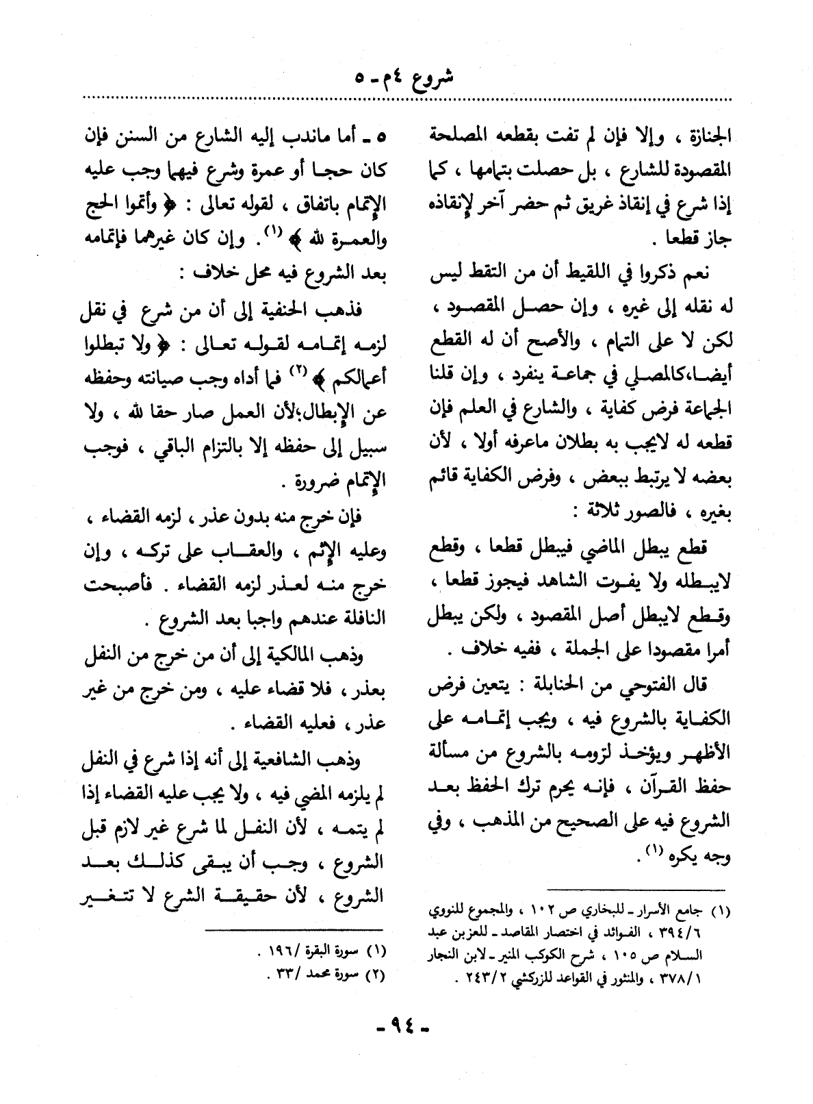 5 - أَمَّا مَا نَدَبَ إِلَيْهِ الشَّارِعُ مِنَ السُّنَنِ فَإِنْ كَانَ حَجًّا أَوْ عُمْرَةً وَشَرَعَ فِيهِمَا وَجَبَ عَلَيْهِ الإِْتْمَامُ بِاتِّفَاقٍ، لِقَوْلِهِ تَعَالَى: {وَأَتِمُّوا الْحَجَّ وَالْعُمْرَةَ لِلَّهِ} (1) . وَإِنْ كَانَ غَيْرَهُمَا فَإِتْمَامُهُ بَعْدَ الشُّرُوعِ فِيهِ مَحَل خِلاَفٍ: