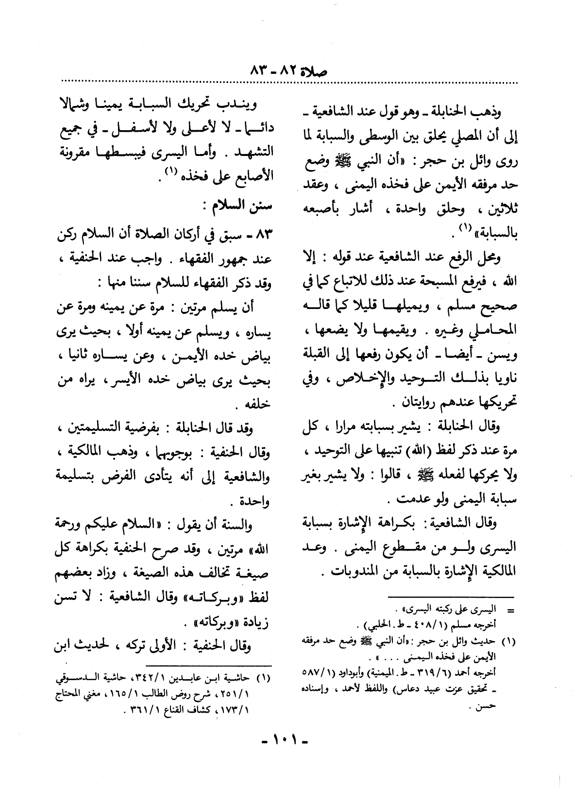 83 - سَبَقَ فِي أَرْكَانِ الصَّلاَةِ أَنَّ السَّلاَمَ رُكْنٌ عِنْدَ جُمْهُورِ الْفُقَهَاءِ. وَاجِبٌ عِنْدَ الْحَنَفِيَّةِ، وَقَدْ ذَكَرَ الْفُقَهَاءُ لِلسَّلاَمِ سُنَنًا مِنْهَا: