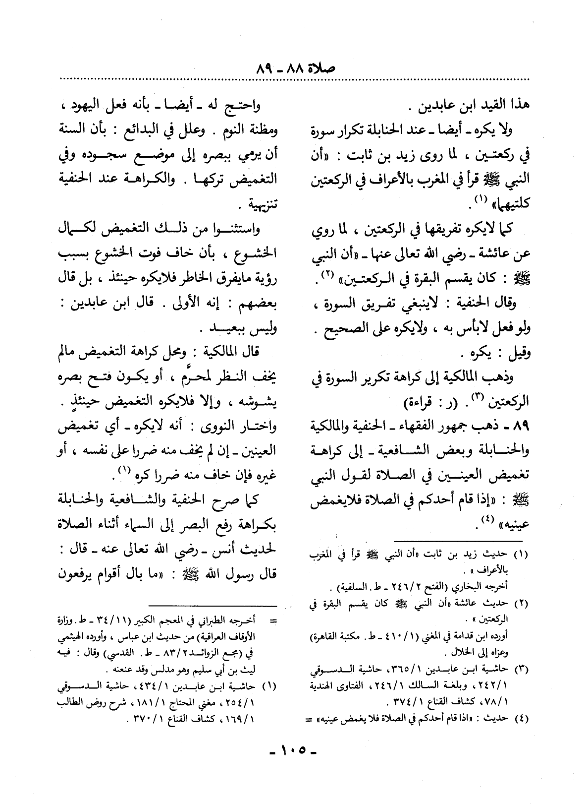 89 - ذَهَبَ جُمْهُورُ الْفُقَهَاءِ - الْحَنَفِيَّةُ وَالْمَالِكِيَّةُ وَالْحَنَابِلَةُ وَبَعْضُ الشَّافِعِيَّةِ - إِلَى كَرَاهَةِ تَغْمِيضِ الْعَيْنَيْنِ فِي الصَّلاَةِ لِقَوْل النَّبِيِّ صَلَّى اللَّهُ عَلَيْهِ وَسَلَّمَ: إِذَا قَامَ أَحَدُكُمْ فِي الصَّلاَةِ فَلاَ يُغْمِضُ عَيْنَيْهِ (4) .