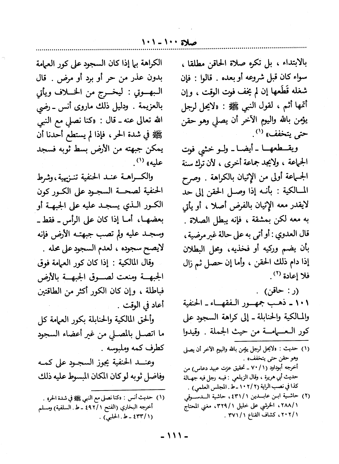 101 - ذَهَبَ جُمْهُورُ الْفُقَهَاءِ - الْحَنَفِيَّةُ وَالْمَالِكِيَّةُ وَالْحَنَابِلَةُ - إِلَى كَرَاهَةِ السُّجُودِ عَلَى كَوْرِ الْعِمَامَةِ مِنْ حَيْثُ الْجُمْلَةُ. وَقَيَّدُوا