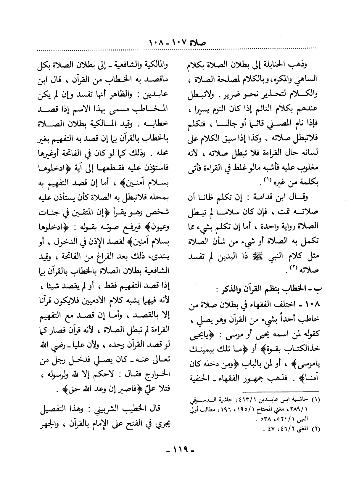108 - اخْتَلَفَ الْفُقَهَاءُ فِي بُطْلاَنِ صَلاَةِ مَنْ خَاطَبَ أَحَدًا بِشَيْءٍ مِنَ الْقُرْآنِ وَهُوَ يُصَلِّي، كَقَوْلِهِ لِمَنِ اسْمُهُ يَحْيَى أَوْ مُوسَى: {يَا يَحْيَى خُذِ الْكِتَابَ بِقُوَّةٍ} أَوْ {مَا تِلْكَ بِيَمِينِكَ يَا مُوسَى} ، أَوْ لِمَنْ بِالْبَابِ {وَمَنْ دَخَلَهُ كَانَ آمِنًا} . فَذَهَبَ جُمْهُورُ الْفُقَهَاءِ - الْحَنَفِيَّةُ