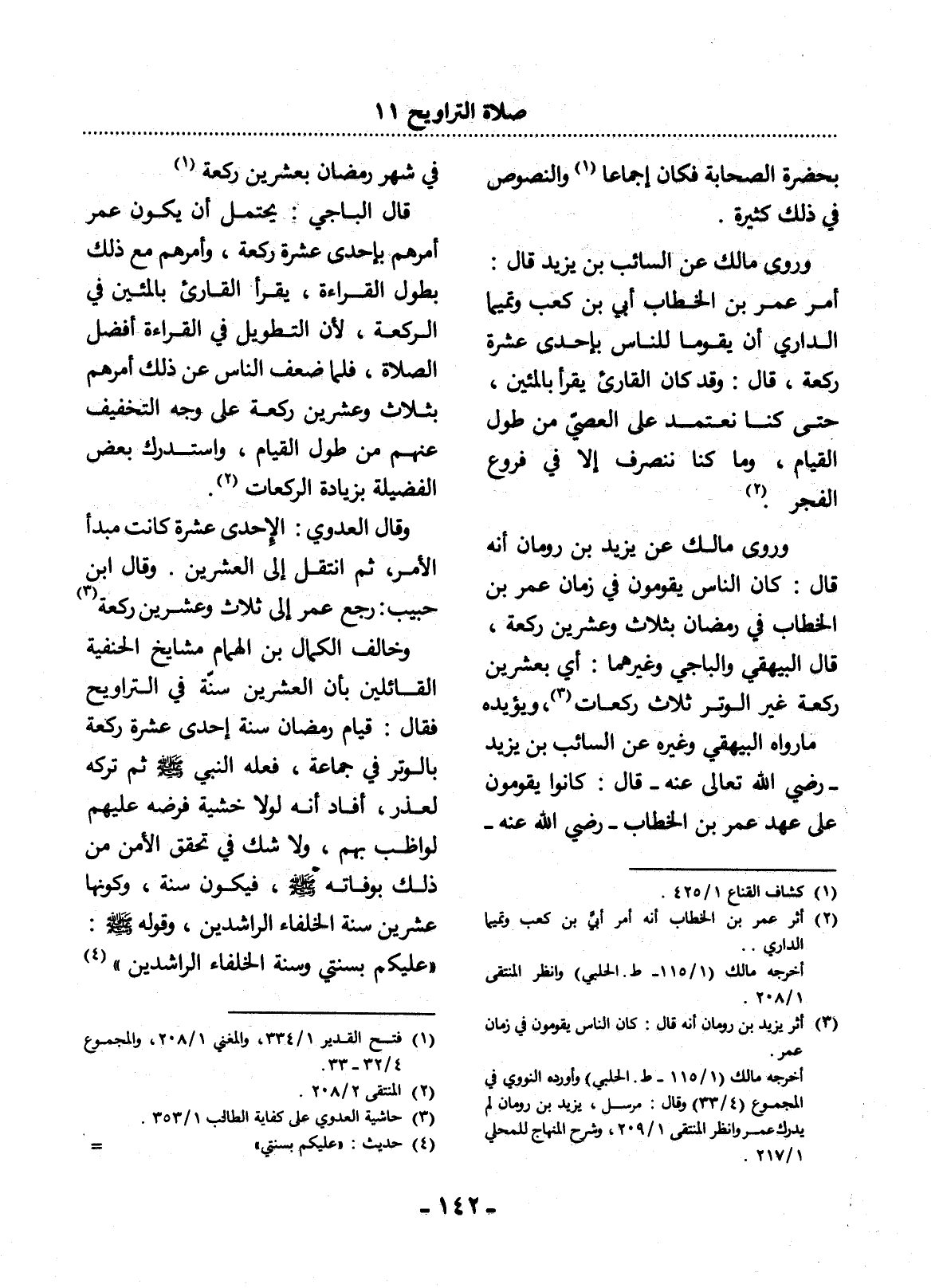 وَرَوَى مَالِكٌ عَنْ يَزِيدَ بْنِ رُومَانَ أَنَّهُ قَال: كَانَ النَّاسُ يَقُومُونَ فِي زَمَانِ عُمَرَ بْنِ الْخَطَّابِ فِي رَمَضَانَ بِثَلاَثٍ وَعِشْرِينَ رَكْعَةً، قَال الْبَيْهَقِيُّ وَالْبَاجِيُّ وَغَيْرُهُمَا: أَيْ بِعَشْرَيْنَ رَكْعَةً غَيْرَ الْوِتْرِ ثَلاَثَ رَكَعَاتٍ (3) ، وَيُؤَيِّدُهُ مَا رَوَاهُ الْبَيْهَقِيُّ وَغَيْرُهُ عَنِ السَّائِبِ بْنِ يَزِيدَ - رَضِيَ اللَّهُ تَعَالَى عَنْهُ - قَال: كَانُوا يَقُومُونَ عَلَى عَهْدِ عُمَرَ بْنِ الْخَطَّابِ - رَضِيَ اللَّهُ عَنْهُ -