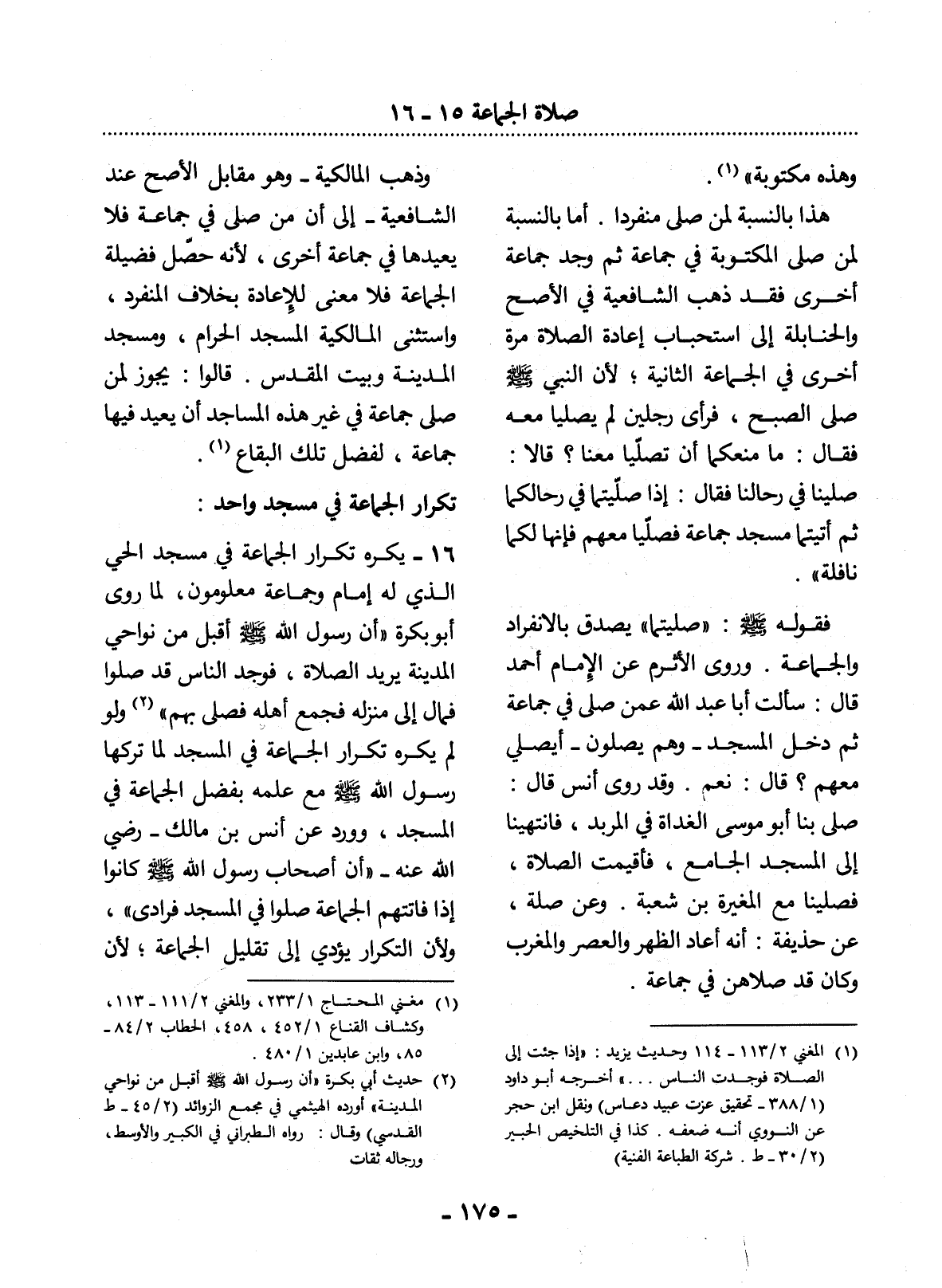 16 - يُكْرَهُ تَكْرَارُ الْجَمَاعَةِ فِي مَسْجِدِ الْحَيِّ الَّذِي لَهُ إِمَامٌ وَجَمَاعَةٌ مَعْلُومُونَ، لِمَا رَوَى أَبُو بَكْرَةَ أَنَّ رَسُول اللَّهِ صَلَّى اللَّهُ عَلَيْهِ وَسَلَّمَ أَقْبَل مِنْ نَوَاحِي الْمَدِينَةِ يُرِيدُ الصَّلاَةَ، فَوَجَدَ النَّاسَ قَدْ صَلَّوْا فَمَال إِلَى مَنْزِلِهِ فَجَمَعَ أَهْلَهُ فَصَلَّى بِهِمْ (2) وَلَوْ لَمْ يُكْرَهْ تَكْرَارُ الْجَمَاعَةِ فِي الْمَسْجِدِ لَمَا تَرَكَهَا رَسُول اللَّهِ صَلَّى اللَّهُ عَلَيْهِ وَسَلَّمَ مَعَ عِلْمِهِ بِفَضْل الْجَمَاعَةِ فِي الْمَسْجِدِ، وَوَرَدَ عَنْ أَنَسِ بْنِ مَالِكٍ - رَضِيَ اللَّهُ عَنْهُ - أَنَّ أَصْحَابَ رَسُول اللَّهِ صَلَّى اللَّهُ عَلَيْهِ وَسَلَّمَ كَانُوا إِذَا فَاتَتْهُمُ الْجَمَاعَةُ صَلَّوْا فِي الْمَسْجِدِ فُرَادَى؛ وَلأَِنَّ التَّكْرَارَ يُؤَدِّي إِلَى تَقْلِيل الْجَمَاعَةِ؛ لأَِنَّ