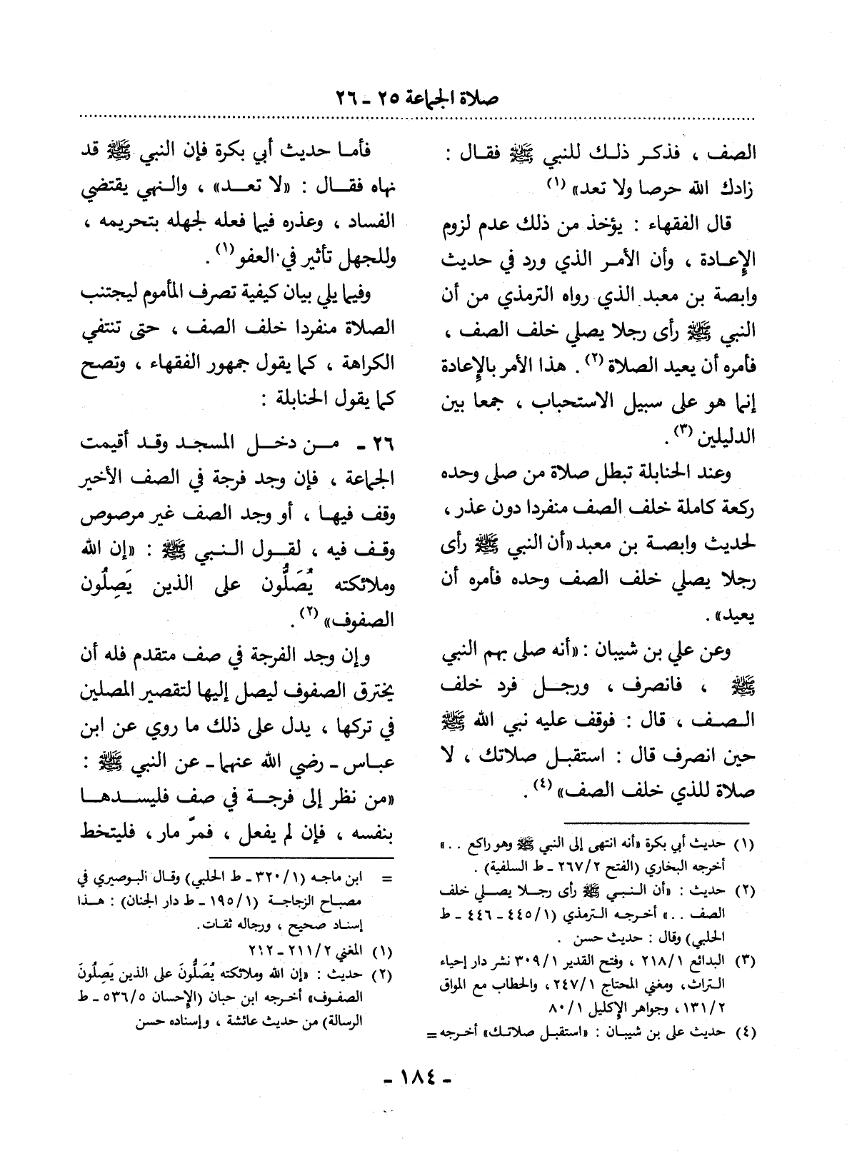 26 - مَنْ دَخَل الْمَسْجِدَ وَقَدْ أُقِيمَتِ الْجَمَاعَةُ، فَإِنْ وَجَدَ فُرْجَةً فِي الصَّفِّ الأَْخِيرِ وَقَفَ فِيهَا، أَوْ وَجَدَ الصَّفَّ غَيْرَ مَرْصُوصٍ وَقَفَ فِيهِ؛ لِقَوْل النَّبِيِّ صَلَّى اللَّهُ عَلَيْهِ وَسَلَّمَ: إِنَّ اللَّهَ وَمَلاَئِكَتَهُ يُصَلُّونَ عَلَى الَّذِينَ يَصِلُونَ الصُّفُوفَ (2) .