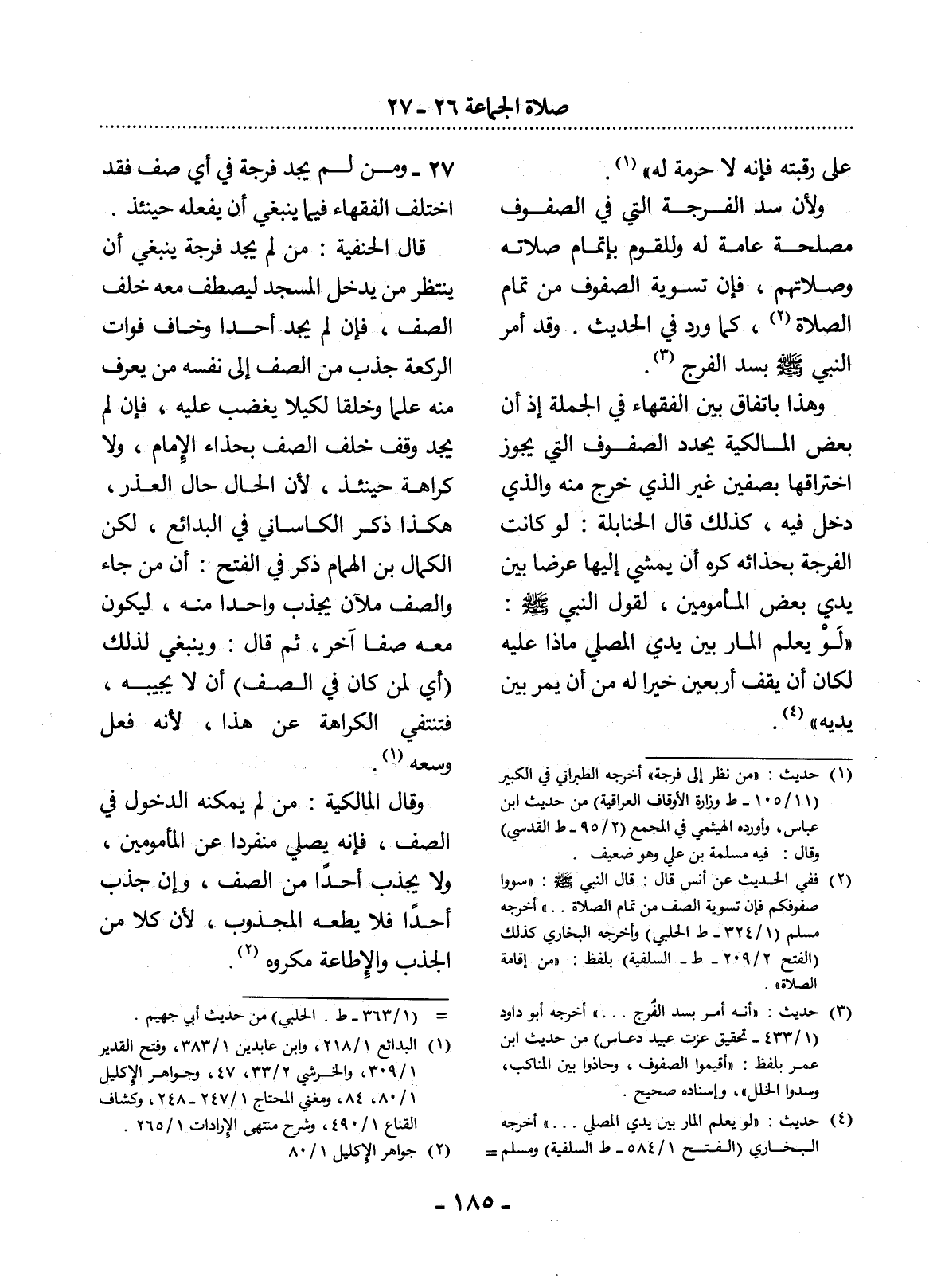 وَهَذَا بِاتِّفَاقٍ بَيْنَ الْفُقَهَاءِ فِي الْجُمْلَةِ إِذْ إِنَّ بَعْضَ الْمَالِكِيَّةِ يُحَدِّدُ الصُّفُوفَ الَّتِي يَجُوزُ اخْتِرَاقُهَا بِصَفَّيْنِ غَيْرِ الَّذِي خَرَجَ مِنْهُ وَاَلَّذِي دَخَل فِيهِ، كَذَلِكَ قَال الْحَنَابِلَةُ: لَوْ كَانَتِ الْفُرْجَةُ بِحِذَائِهِ كُرِهَ أَنْ يَمْشِيَ إِلَيْهَا عَرْضًا بَيْنَ يَدَيْ بَعْضِ الْمَأْمُومِينَ؛ لِقَوْل النَّبِيِّ صَلَّى اللَّهُ عَلَيْهِ وَسَلَّمَ: لَوْ يَعْلَمُ الْمَارُّ بَيْنَ يَدَيِ الْمُصَلِّي مَاذَا عَلَيْهِ لَكَانَ أَنْ يَقِفَ أَرْبَعِينَ خَيْرًا لَهُ مِنْ أَنْ يَمُرَّ بَيْنَ يَدَيْهِ (4) .