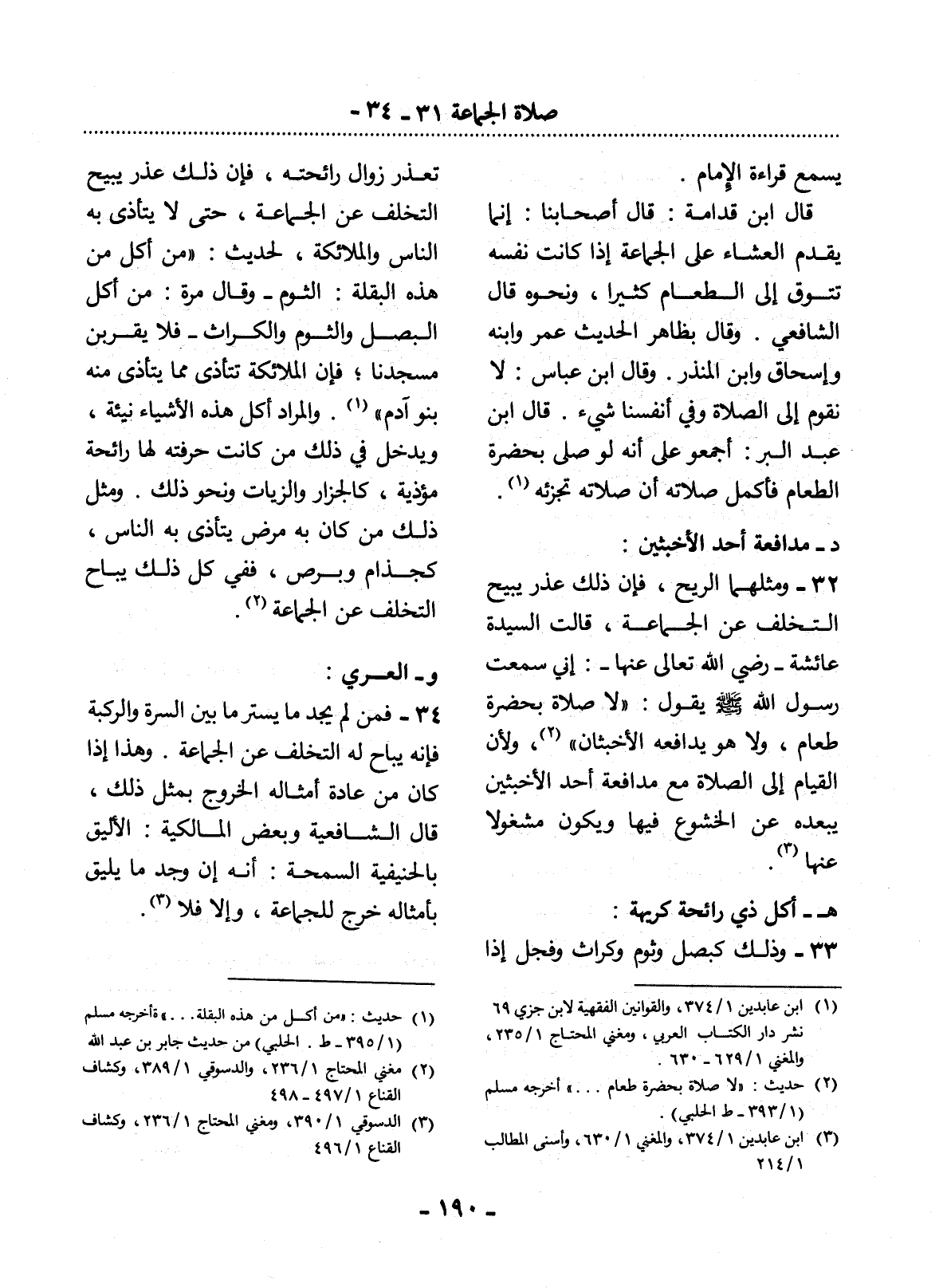 32 - وَمِثْلُهُمَا الرِّيحُ، فَإِنَّ ذَلِكَ عُذْرٌ يُبِيحُ التَّخَلُّفَ عَنِ الْجَمَاعَةِ، قَالَتِ السَّيِّدَةُ عَائِشَةُ - رَضِيَ اللَّهُ تَعَالَى عَنْهَا -: إنِّي سَمِعْتُ رَسُول اللَّهِ صَلَّى اللَّهُ عَلَيْهِ وَسَلَّمَ يَقُول: لاَ صَلاَةَ بِحَضْرَةِ طَعَامٍ، وَلاَ هُوَ يُدَافِعُهُ الأَْخْبَثَانِ (2) ، وَلأَِنَّ الْقِيَامَ إِلَى الصَّلاَةِ مَعَ مُدَافَعَةِ أَحَدِ الأَْخْبَثَيْنِ يُبْعِدُهُ عَنِ الْخُشُوعِ فِيهَا وَيَكُونُ مَشْغُولاً عَنْهَا (3) .