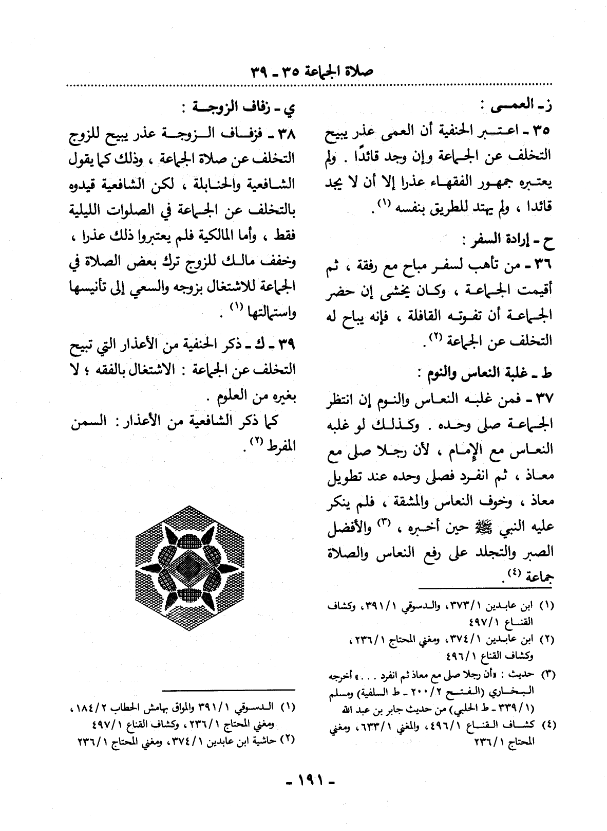 35 - اعْتَبَرَ الْحَنَفِيَّةُ أَنَّ الْعَمَى عُذْرٌ يُبِيحُ التَّخَلُّفَ عَنِ الْجَمَاعَةِ وَإِنْ وَجَدَ قَائِدًا. وَلَمْ يَعْتَبِرْهُ جُمْهُورُ الْفُقَهَاءِ عُذْرًا إِلاَّ أَنْ لاَ يَجِدَ قَائِدًا، وَلَمْ يَهْتَدِ لِلطَّرِيقِ بِنَفْسِهِ (1) .