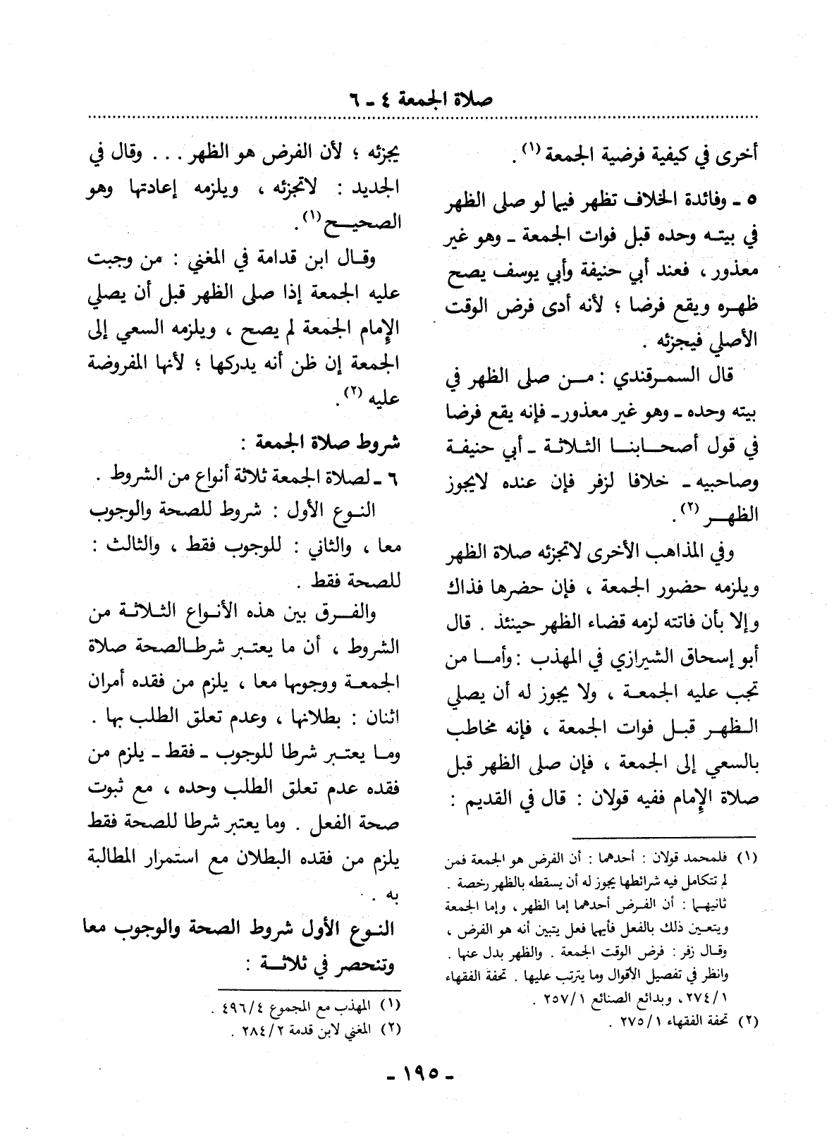 6 - لِصَلاَةِ الْجُمُعَةِ ثَلاَثَةُ أَنْوَاعٍ مِنَ الشُّرُوطِ.