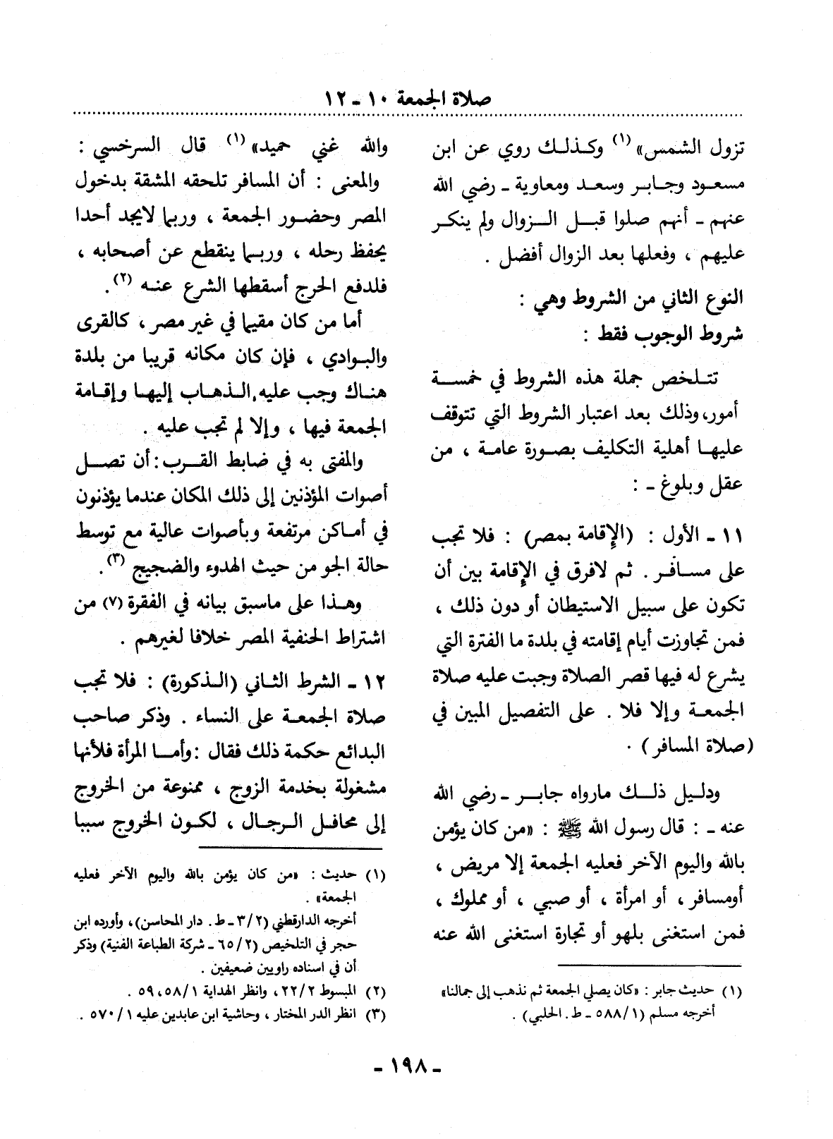 11 - الأَْوَّل: (الإِْقَامَةُ بِمِصْرٍ) : فَلاَ تَجِبُ عَلَى مُسَافِرٍ. ثُمَّ لاَ فَرْقَ فِي الإِْقَامَةِ بَيْنَ أَنْ تَكُونَ عَلَى سَبِيل الاِسْتِيطَانِ أَوْ دُونَ ذَلِكَ، فَمَنْ تَجَاوَزَتْ أَيَّامُ إِقَامَتِهِ فِي بَلْدَةٍ مَا الْفَتْرَةَ الَّتِي يُشْرَعُ لَهُ فِيهَا قَصْرُ الصَّلاَةِ وَجَبَتْ عَلَيْهِ صَلاَةُ الْجُمُعَةِ وَإِلاَّ فَلاَ عَلَى التَّفْصِيل الْمُبَيَّنِ فِي (صَلاَةُ الْمُسَافِرِ) .