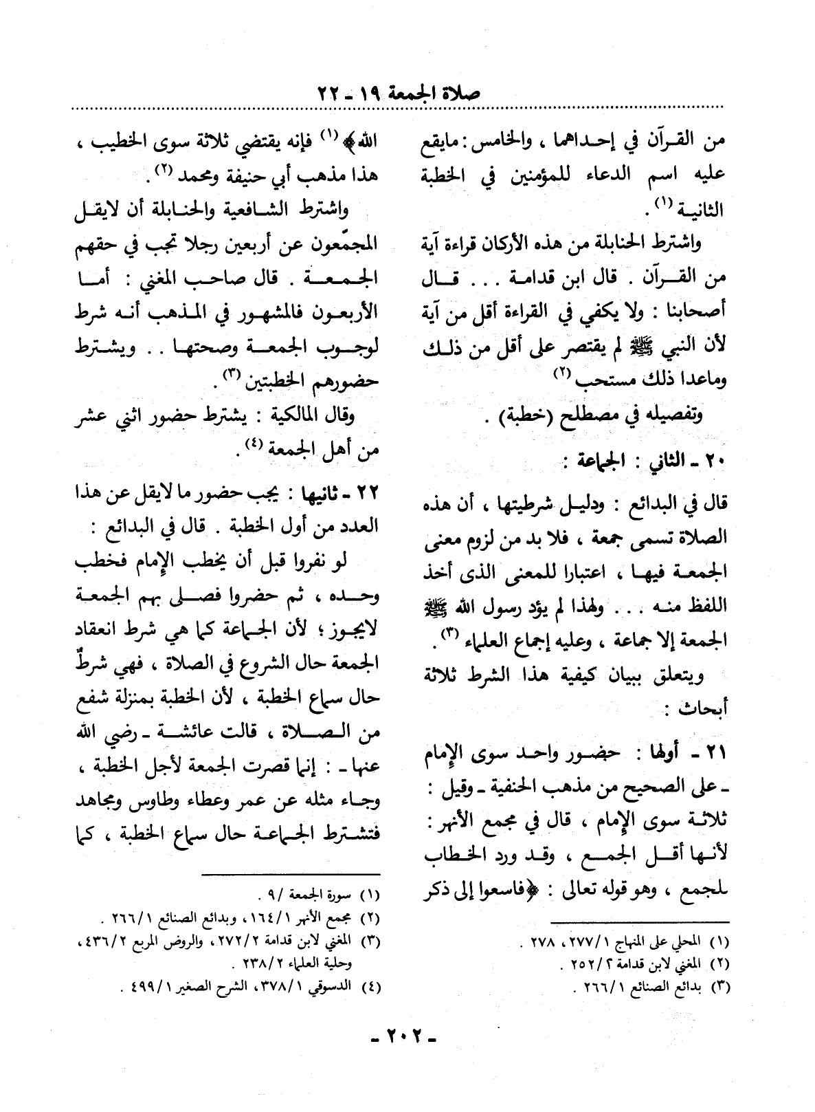 21 - أَوَّلُهَا: حُضُورُ وَاحِدٍ سِوَى الإِْمَامِ - عَلَى الصَّحِيحِ مِنْ مَذْهَبِ الْحَنَفِيَّةِ - وَقِيل: ثَلاَثَةٌ سِوَى الإِْمَامِ، قَال فِي مَجْمَعِ الأَْنْهُرِ: لأَِنَّهَا أَقَل الْجَمْعِ، وَقَدْ وَرَدَ الْخِطَابُ لِلْجَمْعِ، وَهُوَ قَوْله تَعَالَى: {فَاسْعَوْا إِلَى ذِكْرِ