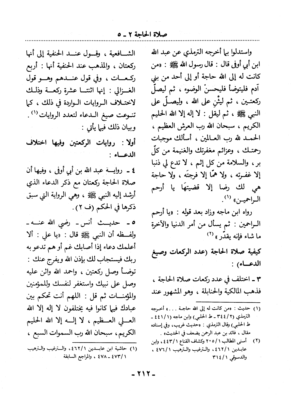 وَاسْتَدَلُّوا بِمَا أَخْرَجَهُ التِّرْمِذِيُّ عَنْ عَبْدِ اللَّهِ بْنِ أَبِي أَوْفَى قَال: قَال رَسُول اللَّهِ صَلَّى اللَّهُ عَلَيْهِ وَسَلَّمَ: مَنْ كَانَتْ لَهُ إِلَى اللَّهِ حَاجَةٌ أَوْ إِلَى أَحَدٍ مِنْ بَنِي آدَمَ فَلْيَتَوَضَّأْ فَلْيُحْسِنِ الْوُضُوءَ، ثُمَّ لْيُصَل رَكْعَتَيْنِ، ثُمَّ لْيُثْنِ عَلَى اللَّهِ، وَلْيُصَل عَلَى النَّبِيِّ صَلَّى اللَّهُ عَلَيْهِ وَسَلَّمَ ثُمَّ لْيَقُل: لاَ إِلَهَ إِلاَّ اللَّهُ الْحَلِيمُ الْكَرِيمُ، سُبْحَانَ اللَّهِ رَبِّ الْعَرْشِ الْعَظِيمِ، الْحَمْدُ لِلَّهِ رَبِّ الْعَالَمِينَ، أَسْأَلُكَ مُوجِبَاتِ رَحْمَتِكَ، وَعَزَائِمَ مَغْفِرَتِكَ وَالْغَنِيمَةَ مِنْ كُل بِرٍّ، وَالسَّلاَمَةَ مِنْ كُل إِثْمٍ، لاَ تَدَعْ لِي ذَنْبًا إِلاَّ غَفَرْتَهُ، وَلاَ هَمًّا إِلاَّ فَرَّجْتَهُ، وَلاَ حَاجَةً هِيَ لَكَ رِضًا إِلاَّ قَضَيْتَهَا يَا أَرْحَمَ الرَّاحِمِينَ (1) .