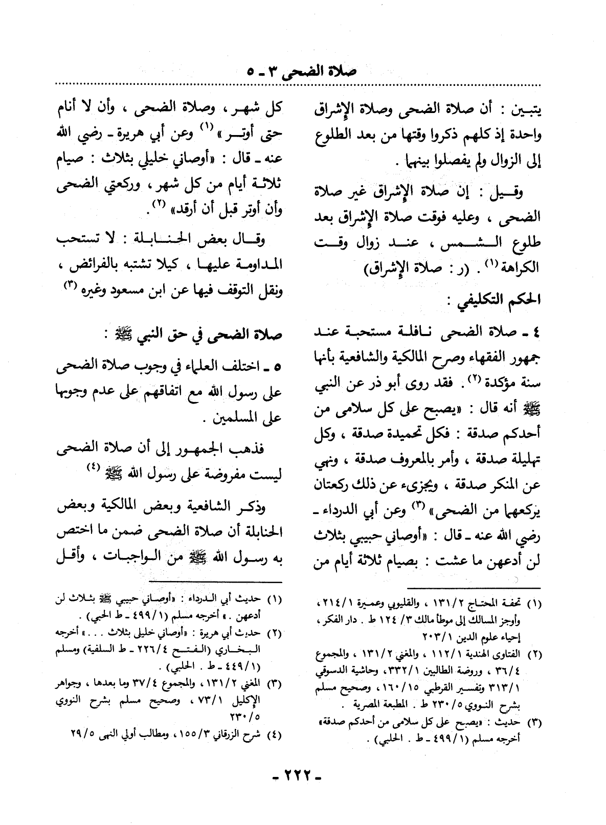 4 - صَلاَةُ الضُّحَى نَافِلَةٌ مُسْتَحَبَّةٌ عِنْدَ جُمْهُورِ الْفُقَهَاءِ وَصَرَّحَ الْمَالِكِيَّةُ وَالشَّافِعِيَّةُ بِأَنَّهَا سُنَّةٌ مُؤَكَّدَةٌ (2) . فَقَدْ رَوَى أَبُو ذَرٍّ عَنِ النَّبِيِّ صَلَّى اللَّهُ عَلَيْهِ وَسَلَّمَ أَنَّهُ قَال: يُصْبِحُ عَلَى كُل سُلاَمَى مِنْ أَحَدِكُمْ صَدَقَةٌ: فَكُل تَحْمِيدَةٍ صَدَقَةٌ، وَكُل تَهْلِيلَةٍ صَدَقَةٌ: وَأَمْرٌ بِالْمَعْرُوفِ صَدَقَةٌ، وَنَهْيٌ عَنِ الْمُنْكَرِ صَدَقَةٌ، وَيُجْزِئُ عَنْ ذَلِكَ رَكْعَتَانِ يَرْكَعُهُمَا مِنَ الضُّحَى (3) وَعَنْ أَبِي الدَّرْدَاءِ - رَضِيَ اللَّهُ عَنْهُ - قَال: أَوْصَانِي حَبِيبِي بِثَلاَثٍ لَنْ أَدَعَهُنَّ مَا عِشْتُ: بِصِيَامِ ثَلاَثَةِ أَيَّامٍ مِنْ