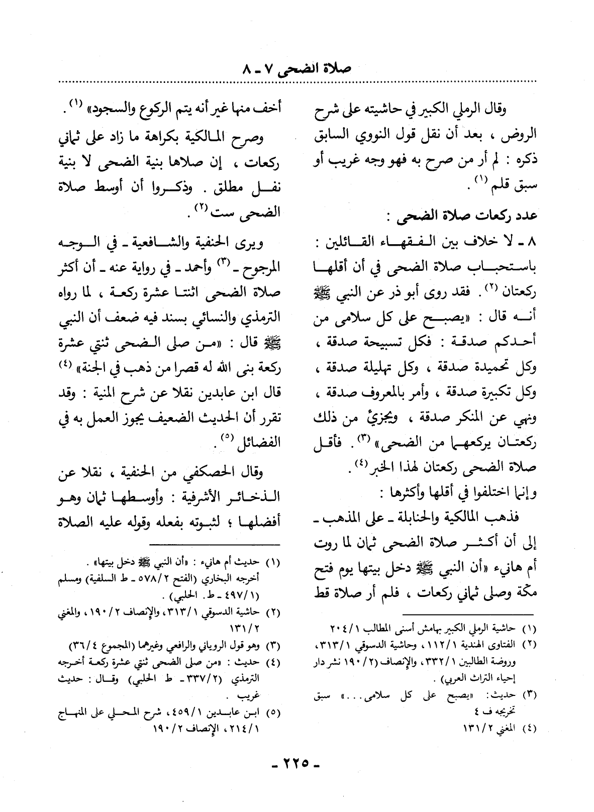 فَذَهَبَ الْمَالِكِيَّةُ وَالْحَنَابِلَةُ - عَلَى الْمَذْهَبِ - إِلَى أَنَّ أَكْثَرَ صَلاَةِ الضُّحَى ثَمَانٍ لِمَا رَوَتْ أُمُّ هَانِئٍ أَنَّ النَّبِيَّ صَلَّى اللَّهُ عَلَيْهِ وَسَلَّمَ دَخَل بَيْتَهَا يَوْمَ فَتْحِ مَكَّةَ وَصَلَّى ثَمَانِيَ رَكَعَاتٍ، فَلَمْ أَرَ صَلاَةً قَطُّ
