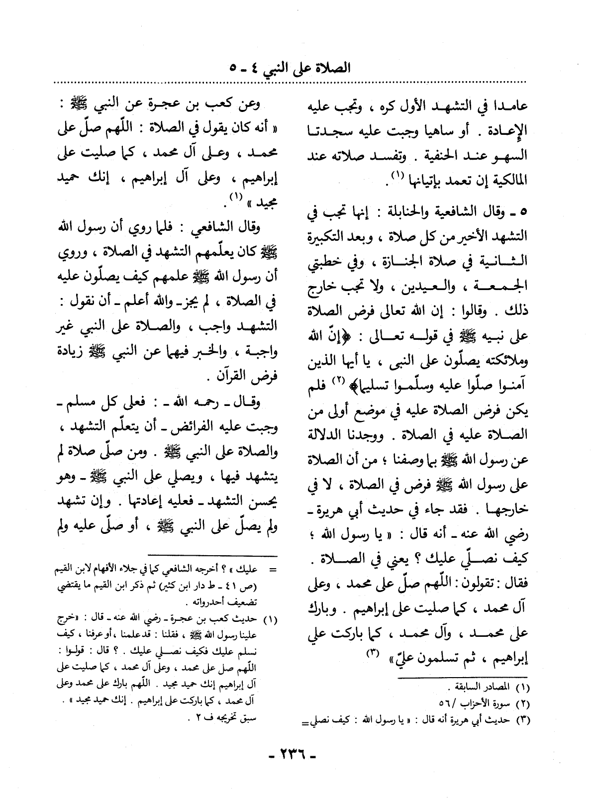 وَعَنْ كَعْبِ بْنِ عُجْرَةَ عَنِ النَّبِيِّ صَلَّى اللَّهُ عَلَيْهِ وَسَلَّمَ: أَنَّهُ كَانَ يَقُول فِي الصَّلاَةِ: اللَّهُمَّ صَل عَلَى مُحَمَّدٍ، وَعَلَى آل مُحَمَّدٍ، كَمَا صَلَّيْتَ عَلَى إِبْرَاهِيمَ، وَعَلَى آل إِبْرَاهِيمَ، إِنَّكَ حَمِيدٌ مَجِيدٌ (1) .