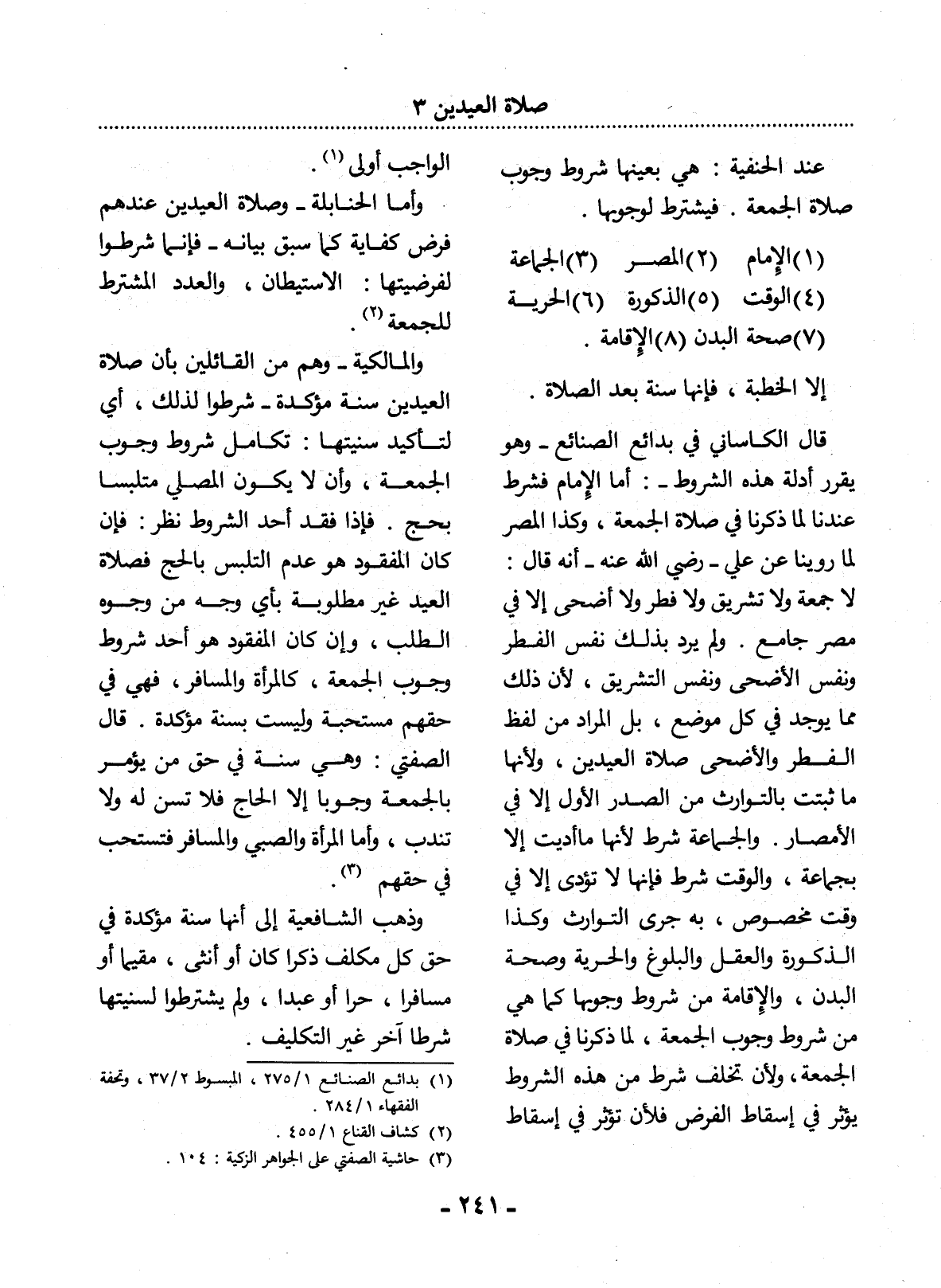 قَال الْكَاسَانِيُّ فِي بَدَائِعِ الصَّنَائِعِ - وَهُوَ يُقَرِّرُ أَدِلَّةَ هَذِهِ الشُّرُوطِ -: أَمَّا الإِْمَامُ فَشَرْطٌ عِنْدَنَا لِمَا ذَكَرْنَا فِي صَلاَةِ الْجُمُعَةِ، وَكَذَا الْمِصْرُ لِمَا روَيْنَا عَنْ عَلِيٍّ - رَضِيَ اللَّهُ عَنْهُ - أَنَّهُ قَال: لاَ جُمُعَةَ وَلاَ تَشْرِيقَ وَلاَ فِطْرَ وَلاَ أَضْحَى إِلاَّ فِي مِصْرٍ جَامِعٍ. وَلَمْ يُرِدْ بِذَلِكَ نَفْسَ الْفِطْرِ وَنَفْسَ الأَْضْحَى وَنَفْسَ التَّشْرِيقِ؛ لأَِنَّ ذَلِكَ مِمَّا يُوجَدُ فِي كُل مَوْضِعٍ، بَل الْمُرَادُ مِنْ لَفْظِ الْفِطْرِ وَالأَْضْحَى صَلاَةُ الْعِيدَيْنِ؛ وَلأَِنَّهَا مَا ثَبَتَتْ بِالتَّوَارُثِ مِنَ الصَّدْرِ الأَْوَّل إِلاَّ فِي الأَْمْصَارِ. وَالْجَمَاعَةُ شَرْطٌ لأَِنَّهَا مَا أُدِّيَتْ إِلاَّ بِجَمَاعَةٍ، وَالْوَقْتُ شَرْطٌ فَإِنَّهَا لاَ تُؤَدَّى إِلاَّ فِي وَقْتٍ مَخْصُوصٍ، بِهِ جَرَى التَّوَارُثُ وَكَذَا الذُّكُورَةُ وَالْعَقْل وَالْبُلُوغُ وَالْحُرِّيَّةُ وَصِحَّةُ الْبَدَنِ، وَالإِْقَامَةُ مِنْ شُرُوطِ وُجُوبِهَا كَمَا هِيَ مِنْ شُرُوطِ وُجُوبِ الْجُمُعَةِ؛ لِمَا ذَكَرْنَا فِي صَلاَةِ الْجُمُعَةِ، وَلأَِنَّ تَخَلُّفَ شَرْطٍ مِنْ هَذِهِ الشُّرُوطِ يُؤَثِّرُ فِي إِسْقَاطِ الْفَرْضِ فَلأََنْ تُؤَثِّرَ فِي إِسْقَاطِ