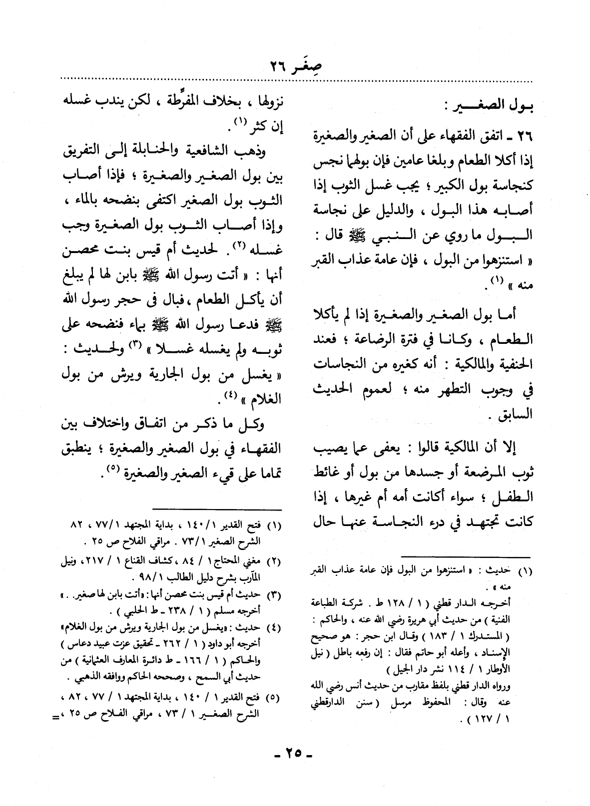 26 - اتَّفَقَ الْفُقَهَاءُ عَلَى أَنَّ الصَّغِيرَ وَالصَّغِيرَةَ إِذَا أَكَلاَ الطَّعَامَ وَبَلَغَا عَامَيْنِ فَإِنَّ بَوْلَهُمَا نَجِسٌ كَنَجَاسَةِ بَوْل الْكَبِيرِ؛ يَجِبُ غَسْل الثَّوْبِ إِذَا أَصَابَهُ هَذَا الْبَوْل، وَالدَّلِيل عَلَى نَجَاسَةِ الْبَوْل مَا رُوِيَ عَنِ النَّبِيِّ صَلَّى اللَّهُ عَلَيْهِ وَسَلَّمَ قَال: اسْتَنْزِهُوا مِنَ الْبَوْل، فَإِنَّ عَامَّةَ عَذَابِ الْقَبْرِ مِنْهُ (1) .