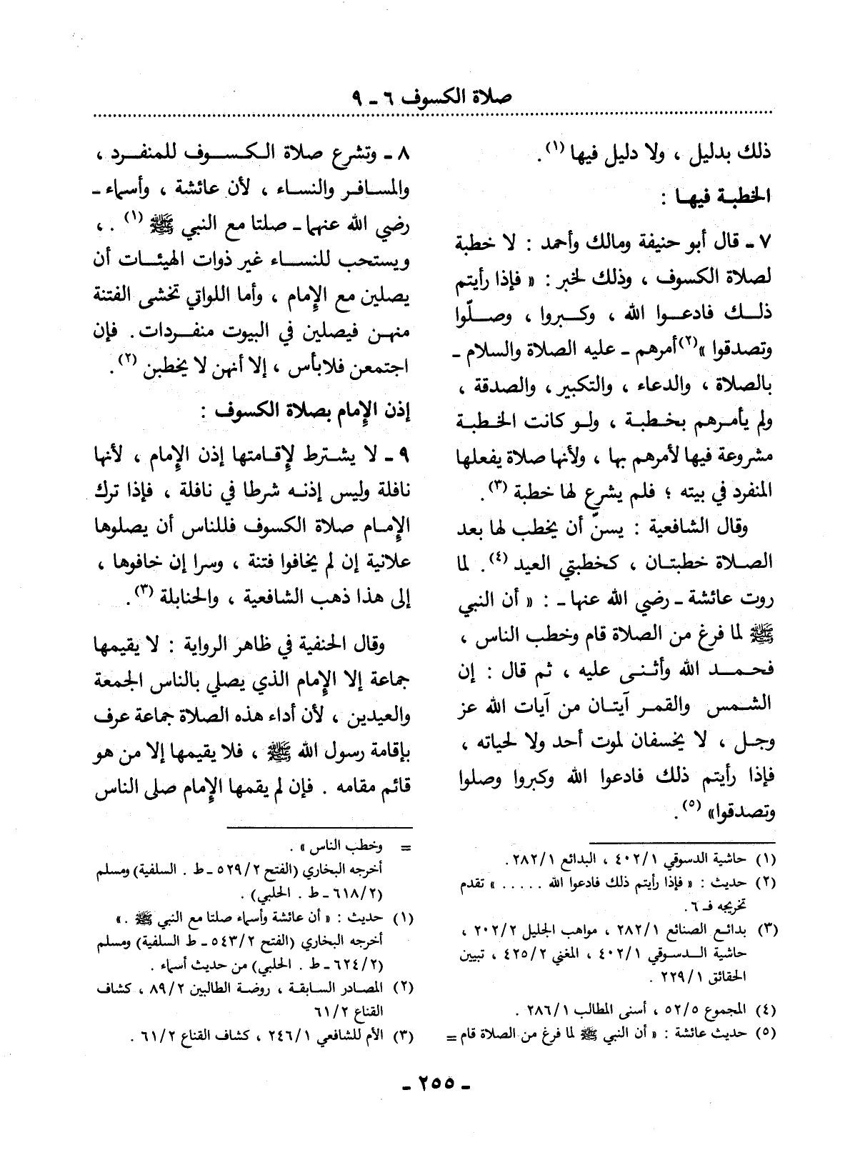 (5) حديث عائشة: " أن النبي صلى الله عليه وسلم لما فرغ من الصلاة قام وخطب الناس ". أخرجه البخاري (الفتح 2 / 529 - ط. السلفية) ومسلم (2 / 618 - ط. الحلبي) .