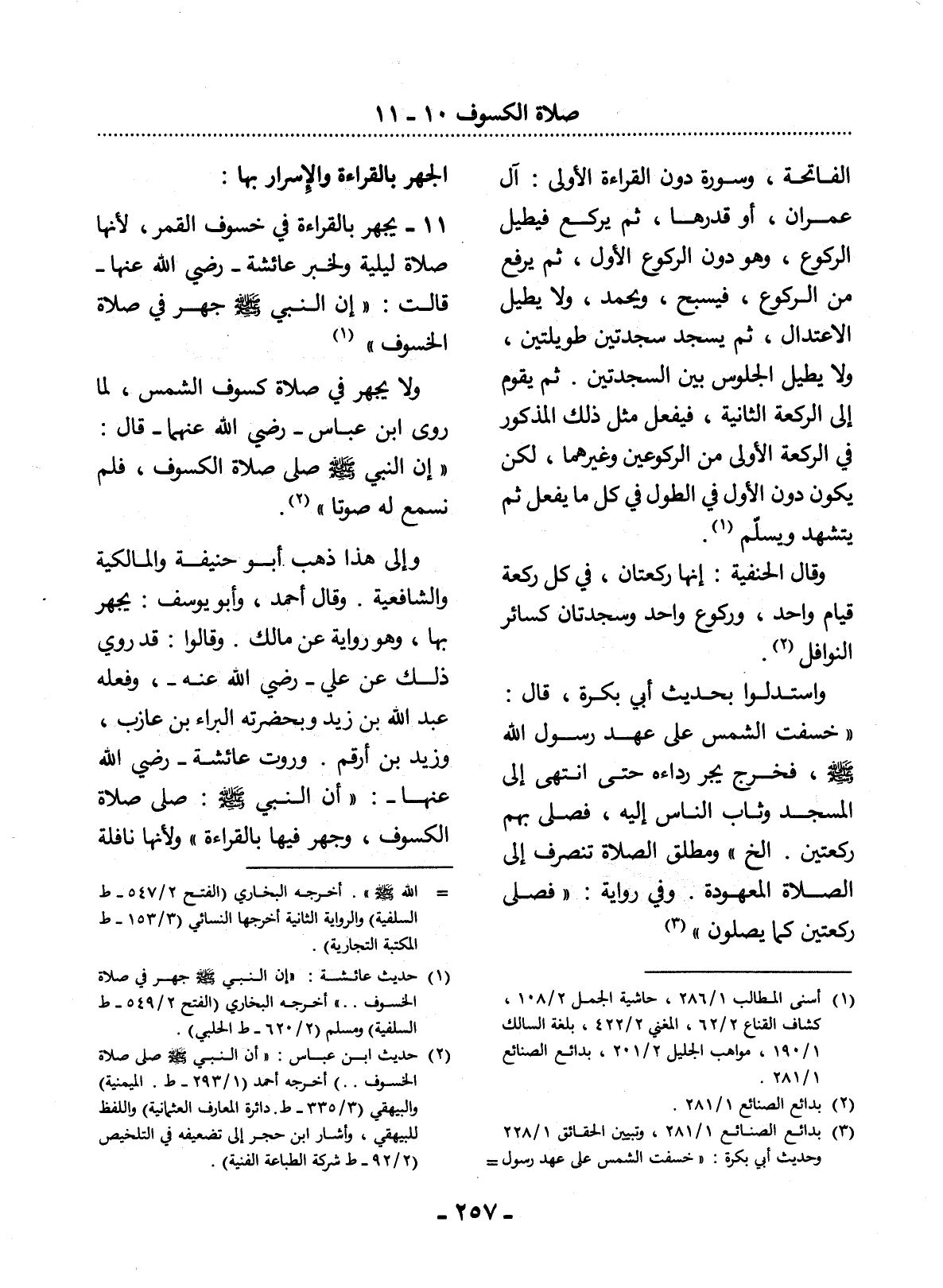 11 - يَجْهَرُ بِالْقِرَاءَةِ فِي خُسُوفِ الْقَمَرِ؛ لأَِنَّهَا صَلاَةٌ لَيْلِيَّةٌ وَلِخَبَرِ عَائِشَةَ - رَضِيَ اللَّهُ عَنْهَا - قَالَتْ: إِنَّ النَّبِيَّ صَلَّى اللَّهُ عَلَيْهِ وَسَلَّمَ جَهَرَ فِي صَلاَةِ الْخُسُوفِ (1)